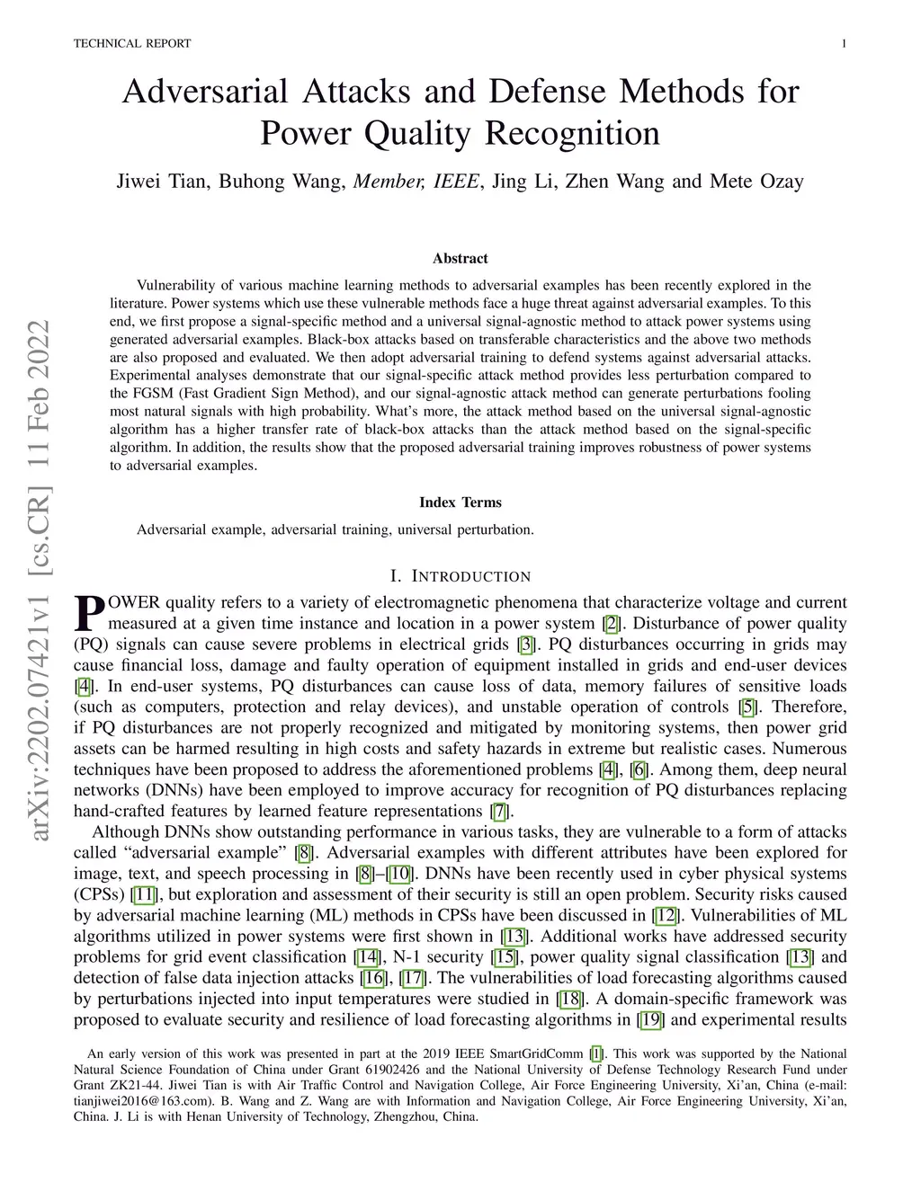 Adversarial Attacks and Defense Methods for Power Quality Recognition