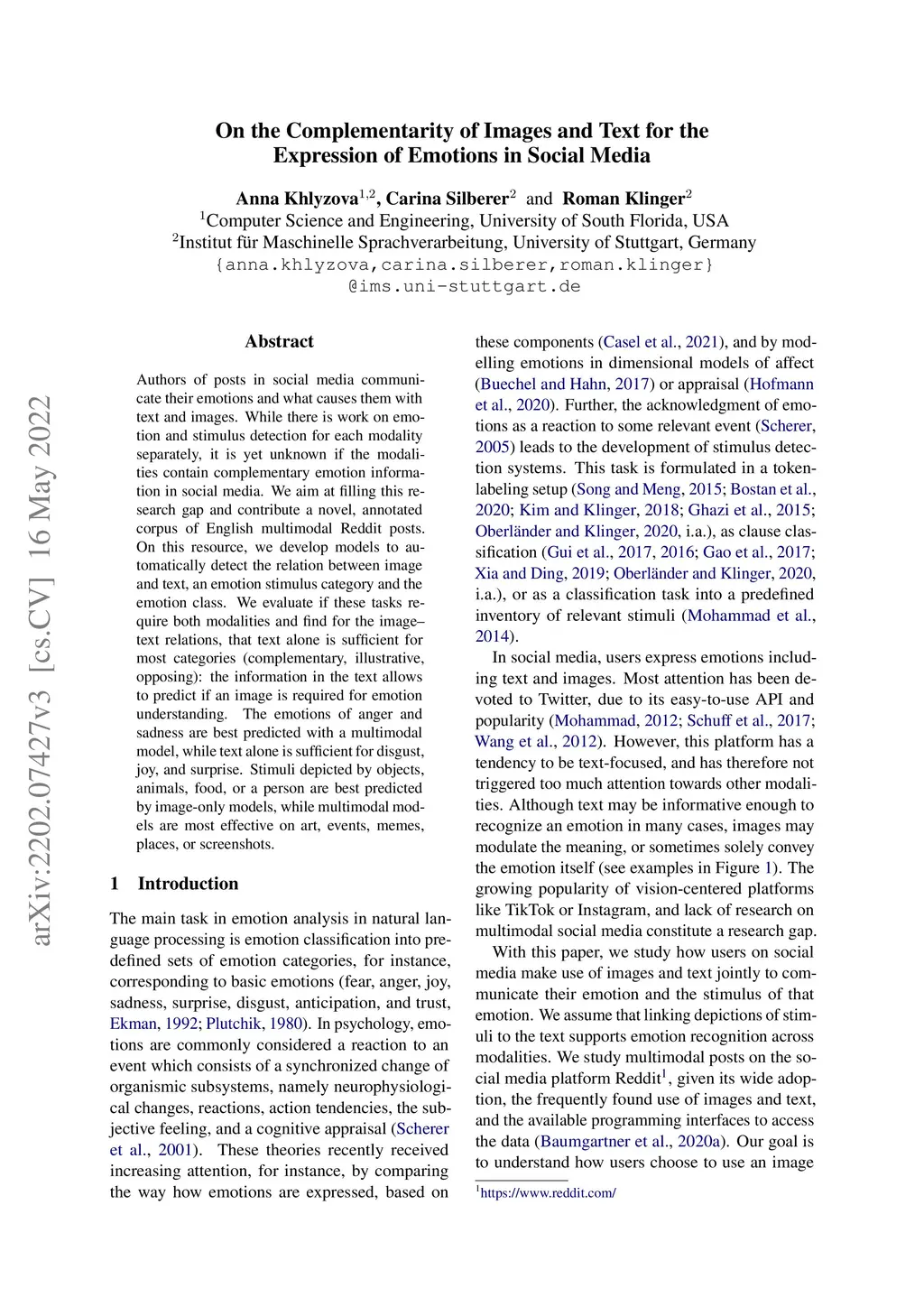 Authors of posts in social media communicate their emotions and what causes them with text and images. While there is work on emotion and stimulus detection for each modality separately, it is yet unknown if the modalities contain complementary emotion information in social media. We aim at filling this research gap and contribute a novel, annotated corpus of English multimodal Reddit posts. On this resource, we develop models to automatically detect the relation between image and text, an emotion stimulus category and the emotion class. We evaluate if these tasks require both modalities and find for the image-text relations, that text alone is sufficient for most categories (complementary, illustrative, opposing): the information in the text allows to predict if an image is required for emotion understanding. The emotions of anger and sadness are best predicted with a multimodal model, while text alone is sufficient for disgust, joy, and surprise. Stimuli depicted by objects, animals, food, or a person are best predicted by image-only models, while multimodal models are most effective on art, events, memes, places, or screenshots.