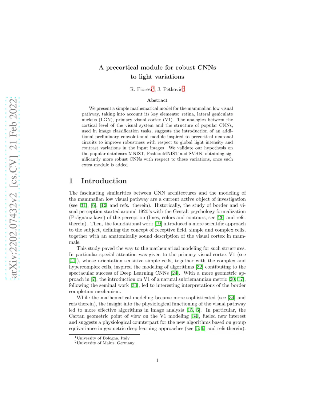 We present a simple mathematical model for the mammalian low visual pathway, taking into account its key elements: retina, lateral geniculate nucleus (LGN), primary visual cortex (V1). The analogies between the cortical level of the visual system and the structure of popular CNNs, used in image classification tasks, suggests the introduction of an additional preliminary convolutional module inspired to precortical neuronal circuits to improve robustness with respect to global light intensity and contrast variations in the input images. We validate our hypothesis on the popular databases MNIST, FashionMNIST and SVHN, obtaining significantly more robust CNNs with respect to these variations, once such extra module is added.