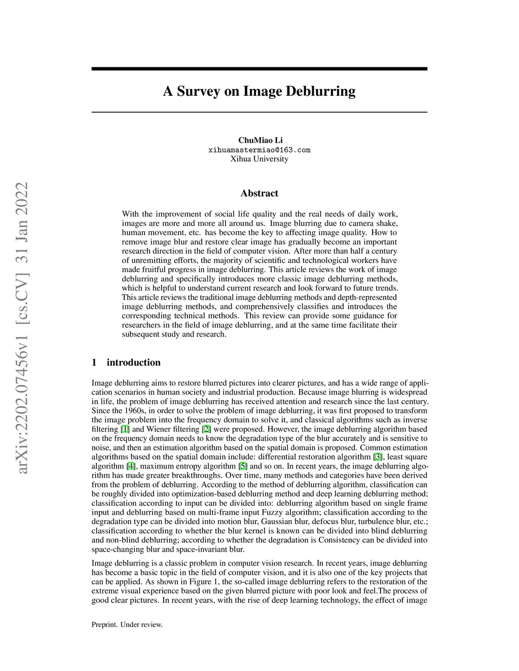 With the improvement of social life quality and the real needs of daily work, images are more and more all around us. Image blurring due to camera shake, human movement, etc. has become the key to affecting image quality. How to remove image blur and restore clear image has gradually become an important research direction in the field of computer vision. After more than half a century of unremitting efforts, the majority of scientific and technological workers have made fruitful progress in image deblurring. This article reviews the work of image deblurring and specifically introduces more classic image deblurring methods, which is helpful to understand current research and look forward to future trends. This article reviews the traditional image deblurring methods and depth-represented image deblurring methods, and comprehensively classifies and introduces the corresponding technical methods. This review can provide some guidance for researchers in the field of image deblurring, and at the same time facilitate their subsequent study and research.