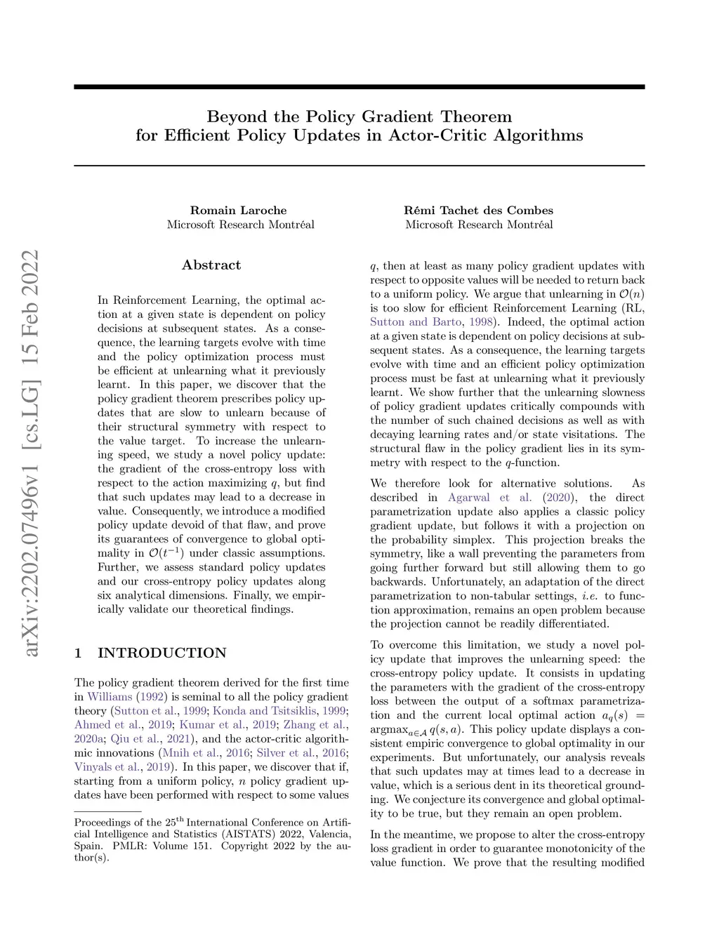 In Reinforcement Learning, the optimal action at a given state is dependent on policy decisions at subsequent states. As a consequence, the learning targets evolve with time and the policy optimization process must be efficient at unlearning what it previously learnt. In this paper, we discover that the policy gradient theorem prescribes policy updates that are slow to unlearn because of their structural symmetry with respect to the value target. To increase the unlearning speed, we study a novel policy update: the gradient of the cross-entropy loss with respect to the action maximizing , but find that such updates may lead to a decrease in value. Consequently, we introduce a modified policy update devoid of that flaw, and prove its guarantees of convergence to global optimality in under classic assumptions. Further, we assess standard policy updates and our cross-entropy policy updates along six analytical dimensions. Finally, we empirically validate our theoretical findings.