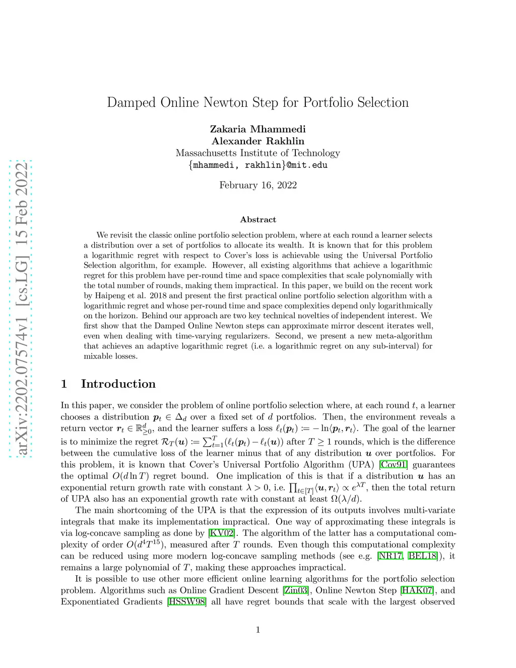Damped Online Newton Step for Portfolio Selection