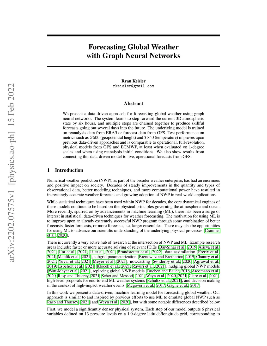 Forecasting Global Weather with Graph Neural Networks