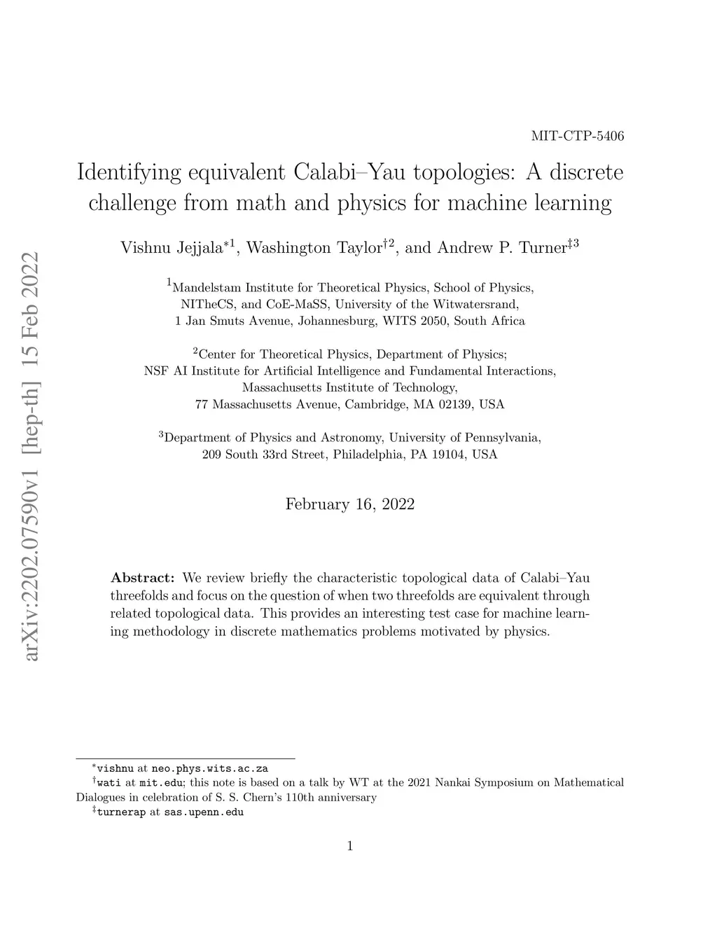 We review briefly the characteristic topological data of Calabi--Yau threefolds and focus on the question of when two threefolds are equivalent through related topological data. This provides an interesting test case for machine learning methodology in discrete mathematics problems motivated by physics.