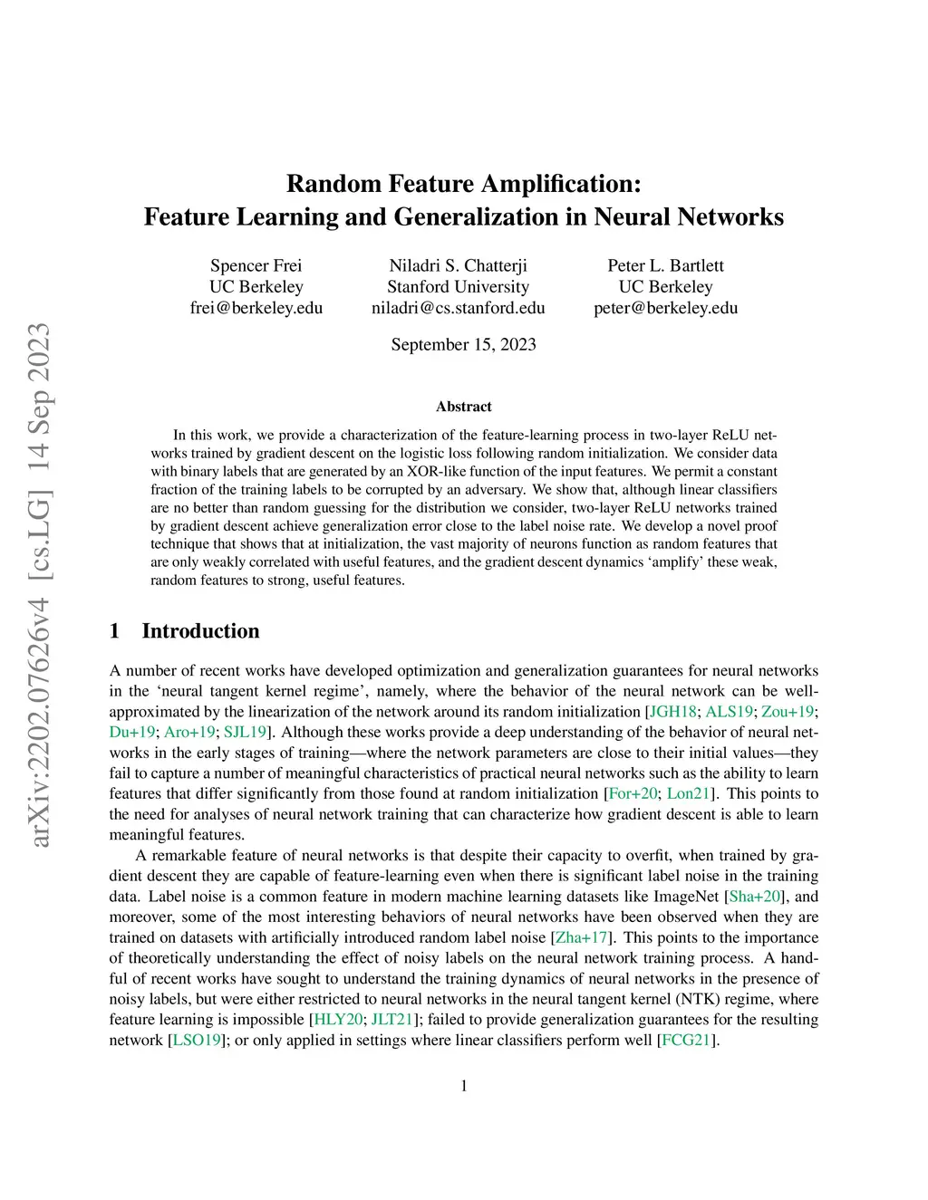 In this work, we provide a characterization of the feature-learning process in two-layer ReLU networks trained by gradient descent on the logistic loss following random initialization. We consider data with binary labels that are generated by an XOR-like function of the input features. We permit a constant fraction of the training labels to be corrupted by an adversary. We show that, although linear classifiers are no better than random guessing for the distribution we consider, two-layer ReLU networks trained by gradient descent achieve generalization error close to the label noise rate. We develop a novel proof technique that shows that at initialization, the vast majority of neurons function as random features that are only weakly correlated with useful features, and the gradient descent dynamics ámplify' these weak, random features to strong, useful features.