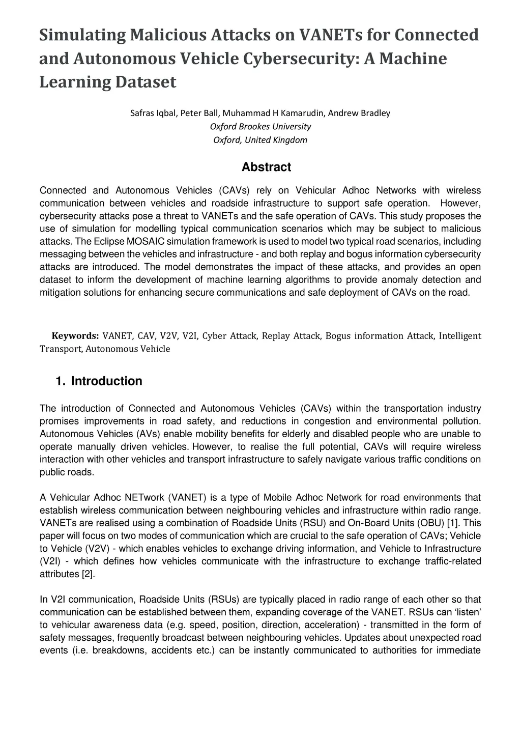 Connected and Autonomous Vehicles (CAVs) rely on Vehicular Adhoc Networks with wireless communication between vehicles and roadside infrastructure to support safe operation. However, cybersecurity attacks pose a threat to VANETs and the safe operation of CAVs. This study proposes the use of simulation for modelling typical communication scenarios which may be subject to malicious attacks. The Eclipse MOSAIC simulation framework is used to model two typical road scenarios, including messaging between the vehicles and infrastructure - and both replay and bogus information cybersecurity attacks are introduced. The model demonstrates the impact of these attacks, and provides an open dataset to inform the development of machine learning algorithms to provide anomaly detection and mitigation solutions for enhancing secure communications and safe deployment of CAVs on the road.