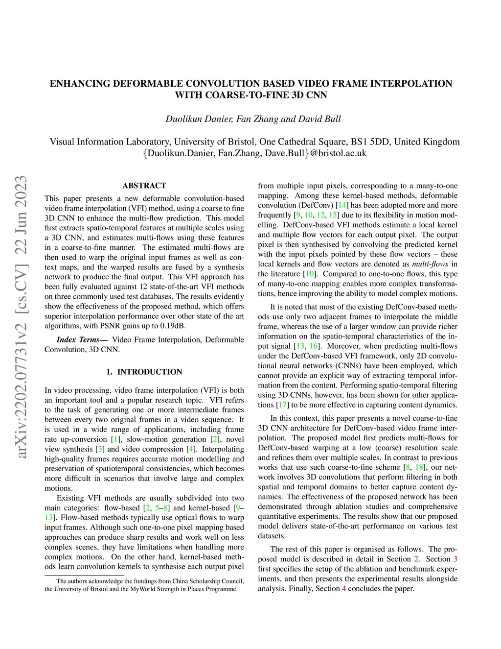 This paper presents a new deformable convolution-based video frame interpolation (VFI) method, using a coarse to fine 3D CNN to enhance the multi-flow prediction. This model first extracts spatio-temporal features at multiple scales using a 3D CNN, and estimates multi-flows using these features in a coarse-to-fine manner. The estimated multi-flows are then used to warp the original input frames as well as context maps, and the warped results are fused by a synthesis network to produce the final output. This VFI approach has been fully evaluated against 12 state-of-the-art VFI methods on three commonly used test databases. The results evidently show the effectiveness of the proposed method, which offers superior interpolation performance over other state of the art algorithms, with PSNR gains up to 0.19dB.