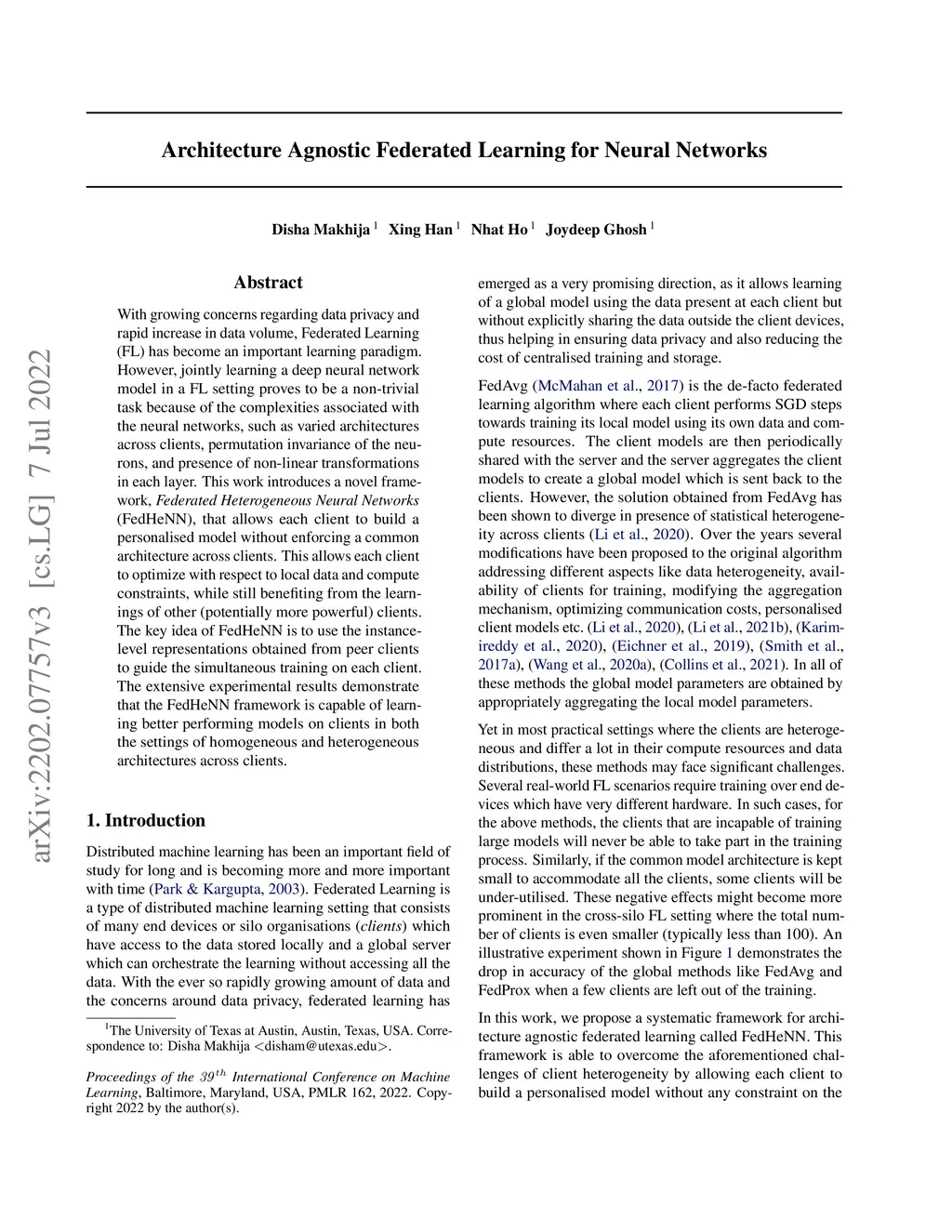 With growing concerns regarding data privacy and rapid increase in data volume, Federated Learning(FL) has become an important learning paradigm. However, jointly learning a deep neural network model in a FL setting proves to be a non-trivial task because of the complexities associated with the neural networks, such as varied architectures across clients, permutation invariance of the neurons, and presence of non-linear transformations in each layer. This work introduces a novel Federated Heterogeneous Neural Networks (FedHeNN) framework that allows each client to build a personalised model without enforcing a common architecture across clients. This allows each client to optimize with respect to local data and compute constraints, while still benefiting from the learnings of other (potentially more powerful) clients. The key idea of FedHeNN is to use the instance-level representations obtained from peer clients to guide the simultaneous training on each client. The extensive experimental results demonstrate that the FedHeNN framework is capable of learning better performing models on clients in both the settings of homogeneous and heterogeneous architectures across clients.