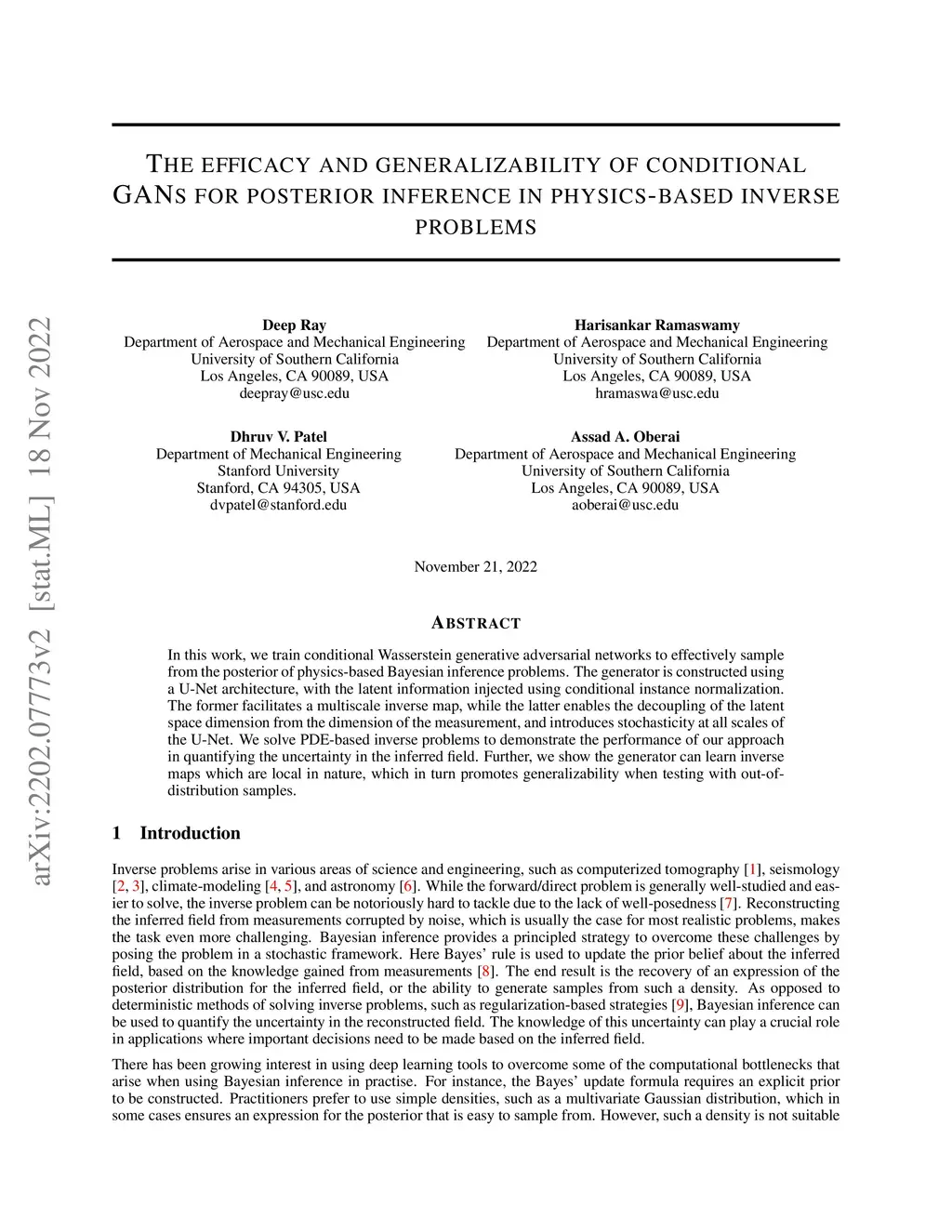 In this work, we train conditional Wasserstein generative adversarial networks to effectively sample from the posterior of physics-based Bayesian inference problems. The generator is constructed using a U-Net architecture, with the latent information injected using conditional instance normalization. The former facilitates a multiscale inverse map, while the latter enables the decoupling of the latent space dimension from the dimension of the measurement, and introduces stochasticity at all scales of the U-Net. We solve PDE-based inverse problems to demonstrate the performance of our approach in quantifying the uncertainty in the inferred field. Further, we show the generator can learn inverse maps which are local in nature, which in turn promotes generalizability when testing with out-of-distribution samples.