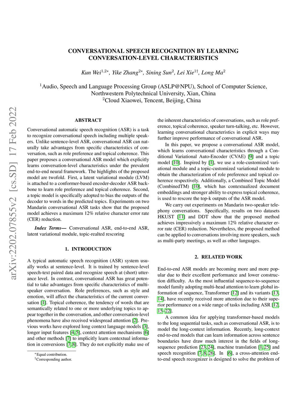 Conversational automatic speech recognition (ASR) is a task to recognize conversational speech including multiple speakers. Unlike sentence-level ASR, conversational ASR can naturally take advantages from specific characteristics of conversation, such as role preference and topical coherence. This paper proposes a conversational ASR model which explicitly learns conversation-level characteristics under the prevalent end-to-end neural framework. The highlights of the proposed model are twofold. First, a latent variational module (LVM) is attached to a conformer-based encoder-decoder ASR backbone to learn role preference and topical coherence. Second, a topic model is specifically adopted to bias the outputs of the decoder to words in the predicted topics. Experiments on two Mandarin conversational ASR tasks show that the proposed model achieves a maximum 12% relative character error rate (CER) reduction.