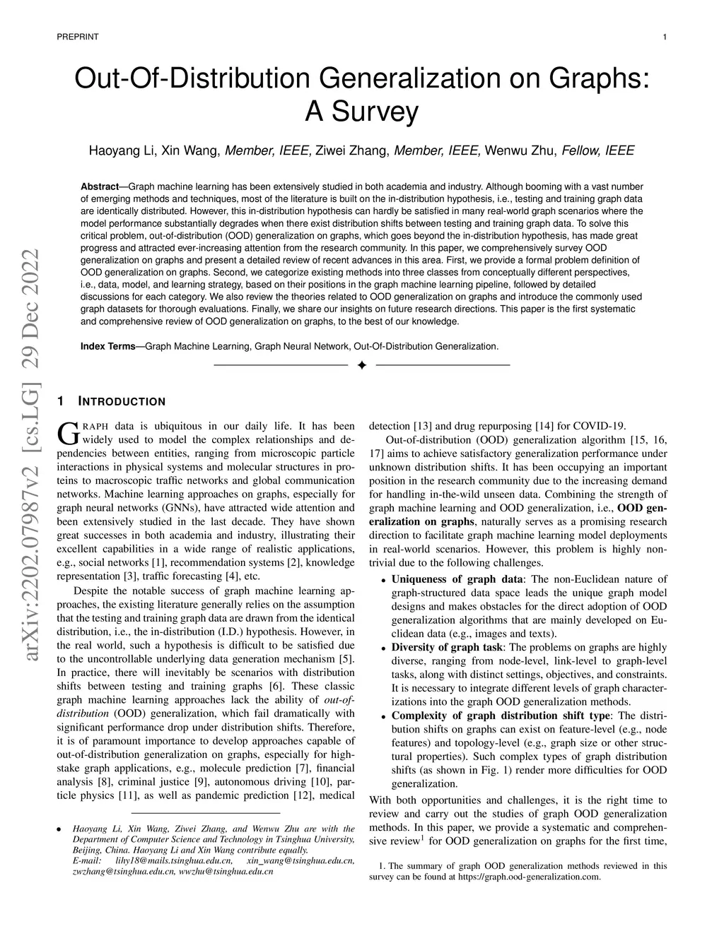 Graph machine learning has been extensively studied in both academia and industry. Although booming with a vast number of emerging methods and techniques, most of the literature is built on the in-distribution hypothesis, i.e., testing and training graph data are identically distributed. However, this in-distribution hypothesis can hardly be satisfied in many real-world graph scenarios where the model performance substantially degrades when there exist distribution shifts between testing and training graph data. To solve this critical problem, out-of-distribution (OOD) generalization on graphs, which goes beyond the in-distribution hypothesis, has made great progress and attracted ever-increasing attention from the research community. In this paper, we comprehensively survey OOD generalization on graphs and present a detailed review of recent advances in this area. First, we provide a formal problem definition of OOD generalization on graphs. Second, we categorize existing methods into three classes from conceptually different perspectives, i.e., data, model, and learning strategy, based on their positions in the graph machine learning pipeline, followed by detailed discussions for each category. We also review the theories related to OOD generalization on graphs and introduce the commonly used graph datasets for thorough evaluations. Finally, we share our insights on future research directions. This paper is the first systematic and comprehensive review of OOD generalization on graphs, to the best of our knowledge.