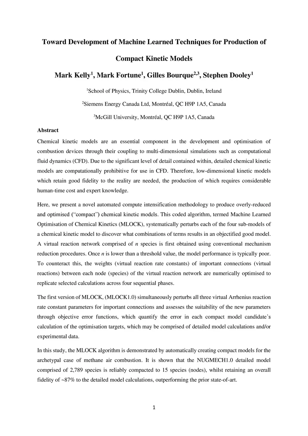 Chemical kinetic models are an essential component in the development and optimisation of combustion devices through their coupling to multi-dimensional simulations such as computational fluid dynamics (CFD). Low-dimensional kinetic models which retain good fidelity to the reality are needed, the production of which requires considerable human-time cost and expert knowledge. Here, we present a novel automated compute intensification methodology to produce overly-reduced and optimised (compact) chemical kinetic models. This algorithm, termed Machine Learned Optimisation of Chemical Kinetics (MLOCK), systematically perturbs each of the four sub-models of a chemical kinetic model to discover what combinations of terms results in a good model. A virtual reaction network comprised of n species is first obtained using conventional mechanism reduction. To counteract the imposed decrease in model performance, the weights (virtual reaction rate constants) of important connections (virtual reactions) between each node (species) of the virtual reaction network are numerically optimised to replicate selected calculations across four sequential phases. The first version of MLOCK, (MLOCK1.0) simultaneously perturbs all three virtual Arrhenius reaction rate constant parameters for important connections and assesses the suitability of the new parameters through objective error functions, which quantify the error in each compact model candidate's calculation of the optimisation targets, which may be comprised of detailed model calculations and/or experimental data. MLOCK1.0 is demonstrated by creating compact models for the archetypal case of methane air combustion. It is shown that the NUGMECH1.0 detailed model comprised of 2,789 species is reliably compacted to 15 species (nodes), whilst retaining an overall fidelity of ~87% to the detailed model calculations, outperforming the prior state-of-art.
