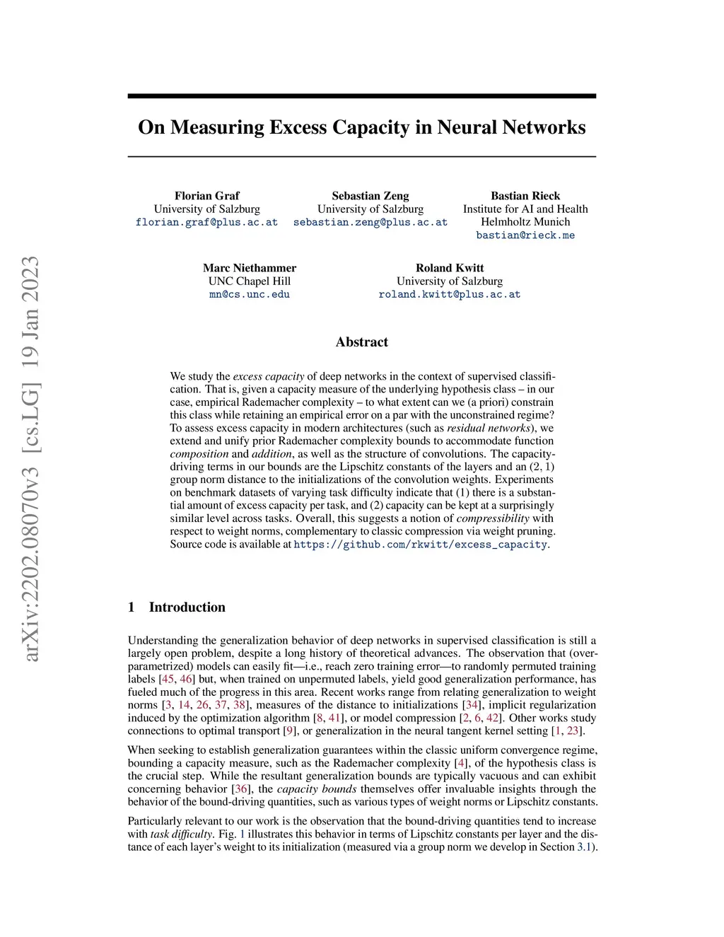 We study the excess capacity of deep networks in the context of supervised classification. That is, given a capacity measure of the underlying hypothesis class -- in our case, Rademacher complexity -- how much can we (a-priori) constrain this class while maintaining an empirical error comparable to the unconstrained setting. To assess excess capacity in modern architectures, we first extend an existing generalization bound to accommodate function composition and addition, as well as the specific structure of convolutions. This then facilitates studying residual networks through the lens of the accompanying capacity measure. The key quantities driving this measure are the Lipschitz constants of the layers and the (2,1) group norm distance to the initializations of the convolution weights. We show that these quantities (1) can be kept surprisingly small and, (2) since excess capacity unexpectedly increases with task difficulty, this points towards an unnecessarily large capacity of unconstrained models.