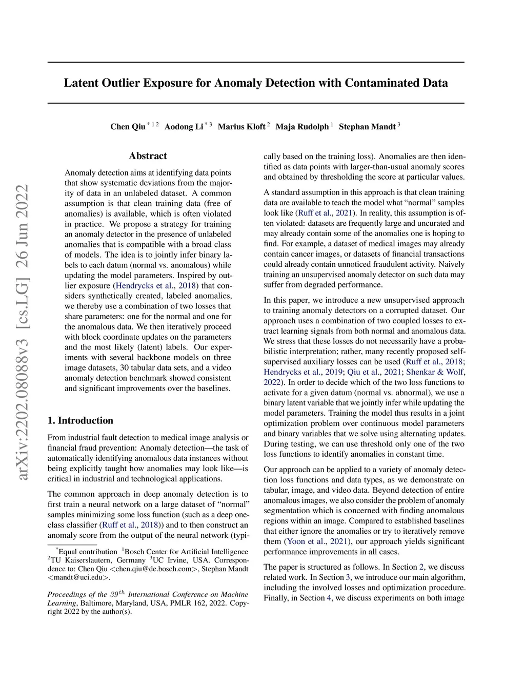 Anomaly detection aims at identifying data points that show systematic deviations from the majority of data in an unlabeled dataset. A common assumption is that clean training data (free of anomalies) is available, which is often violated in practice. We propose a strategy for training an anomaly detector in the presence of unlabeled anomalies that is compatible with a broad class of models. The idea is to jointly infer binary labels to each datum (normal vs. anomalous) while updating the model parameters. Inspired by outlier exposure (Hendrycks et al., 2018) that considers synthetically created, labeled anomalies, we thereby use a combination of two losses that share parameters: one for the normal and one for the anomalous data. We then iteratively proceed with block coordinate updates on the parameters and the most likely (latent) labels. Our experiments with several backbone models on three image datasets, 30 tabular data sets, and a video anomaly detection benchmark showed consistent and significant improvements over the baselines.