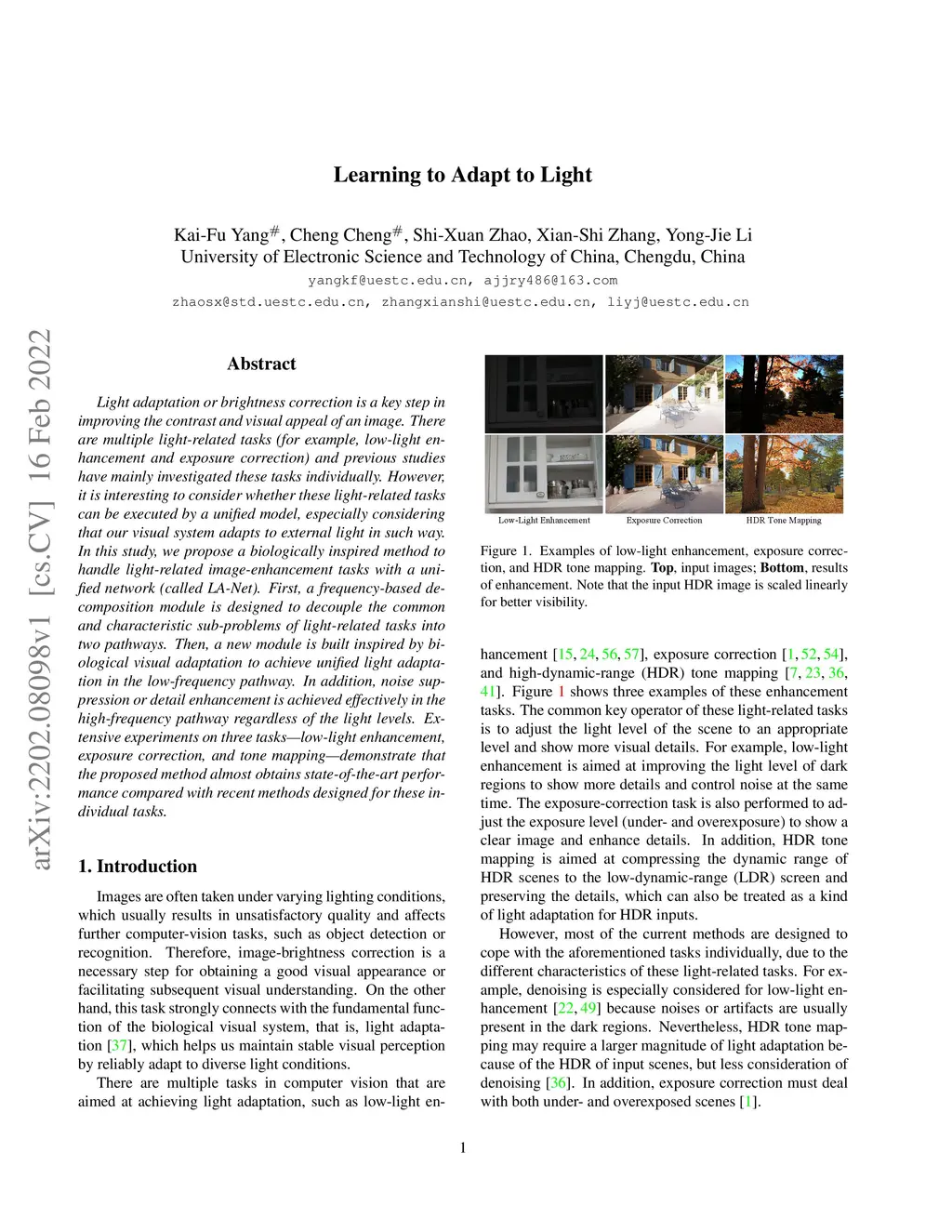 Light adaptation or brightness correction is a key step in improving the contrast and visual appeal of an image. There are multiple light-related tasks (for example, low-light enhancement and exposure correction) and previous studies have mainly investigated these tasks individually. However, it is interesting to consider whether these light-related tasks can be executed by a unified model, especially considering that our visual system adapts to external light in such way. In this study, we propose a biologically inspired method to handle light-related image-enhancement tasks with a unified network (called LA-Net). First, a frequency-based decomposition module is designed to decouple the common and characteristic sub-problems of light-related tasks into two pathways. Then, a new module is built inspired by biological visual adaptation to achieve unified light adaptation in the low-frequency pathway. In addition, noise suppression or detail enhancement is achieved effectively in the high-frequency pathway regardless of the light levels. Extensive experiments on three tasks -- low-light enhancement, exposure correction, and tone mapping -- demonstrate that the proposed method almost obtains state-of-the-art performance compared with recent methods designed for these individual tasks.