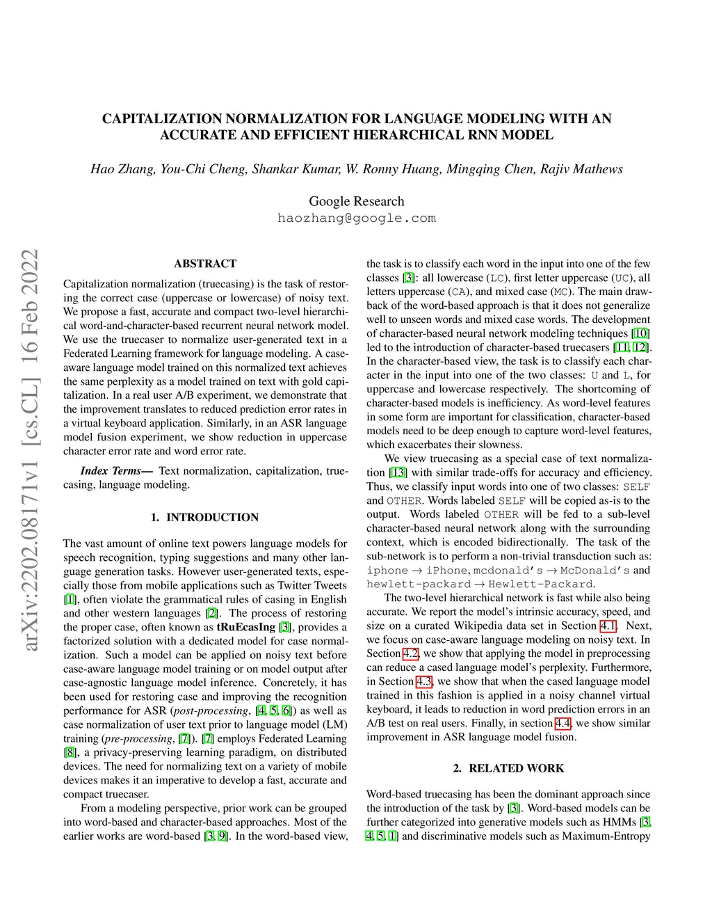 Capitalization normalization (truecasing) is the task of restoring the correct case (uppercase or lowercase) of noisy text. We propose a fast, accurate and compact two-level hierarchical word-and-character-based recurrent neural network model. We use the truecaser to normalize user-generated text in a Federated Learning framework for language modeling. A case-aware language model trained on this normalized text achieves the same perplexity as a model trained on text with gold capitalization. In a real user A/B experiment, we demonstrate that the improvement translates to reduced prediction error rates in a virtual keyboard application. Similarly, in an ASR language model fusion experiment, we show reduction in uppercase character error rate and word error rate.