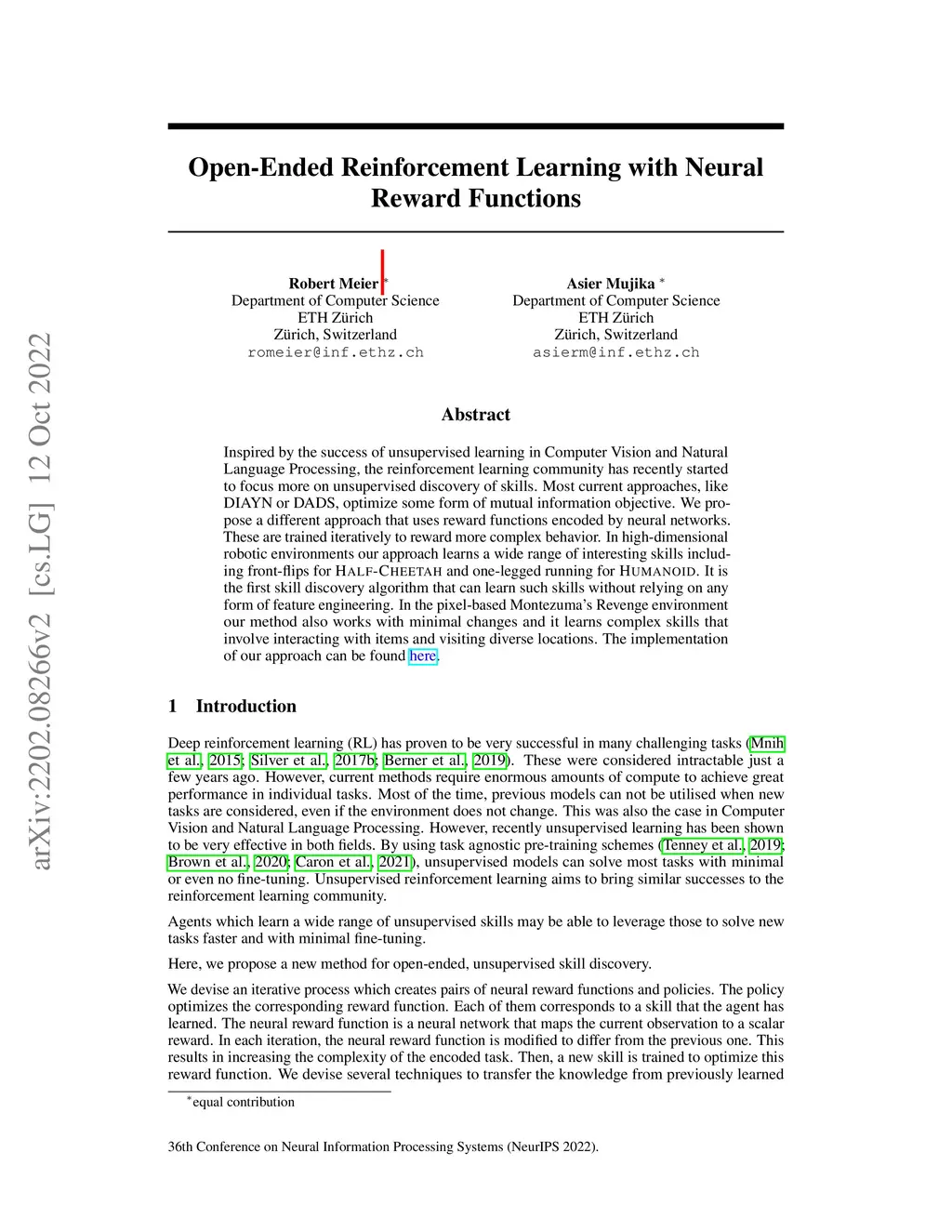 Open-Ended Reinforcement Learning with Neural Reward Functions