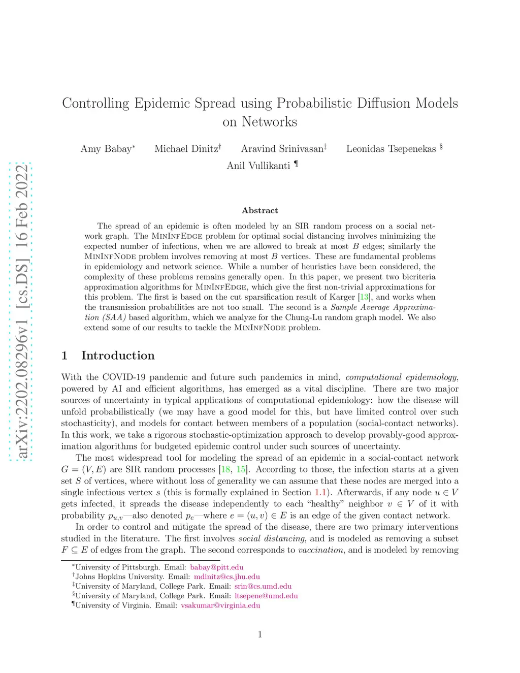 The spread of an epidemic is often modeled by an SIR random process on a social network graph. The MinINF problem for optimal social distancing involves minimizing the expected number of infections, when we are allowed to break at most edges; similarly the MinINFNode problem involves removing at most vertices. These are fundamental problems in epidemiology and network science. While a number of heuristics have been considered, the complexity of these problems remains generally open. In this paper, we present two bicriteria approximation algorithms for MinINF, which give the first non-trivial approximations for this problem. The first is based on the cut sparsification result of Karger \cite{karger:mathor99}, and works when the transmission probabilities are not too small. The second is a Sample Average Approximation (SAA) based algorithm, which we analyze for the Chung-Lu random graph model. We also extend some of our results to tackle the MinINFNode problem.