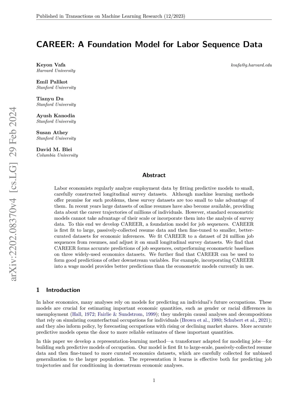 Labor economists regularly analyze employment data by fitting predictive models to small, carefully constructed longitudinal survey datasets. Although machine learning methods offer promise for such problems, these survey datasets are too small to take advantage of them. In recent years large datasets of online resumes have also become available, providing data about the career trajectories of millions of individuals. However, standard econometric models cannot take advantage of their scale or incorporate them into the analysis of survey data. To this end we develop CAREER, a foundation model for job sequences. CAREER is first fit to large, passively-collected resume data and then fine-tuned to smaller, better-curated datasets for economic inferences. We fit CAREER to a dataset of 24 million job sequences from resumes, and adjust it on small longitudinal survey datasets. We find that CAREER forms accurate predictions of job sequences, outperforming econometric baselines on three widely-used economics datasets. We further find that CAREER can be used to form good predictions of other downstream variables. For example, incorporating CAREER into a wage model provides better predictions than the econometric models currently in use.