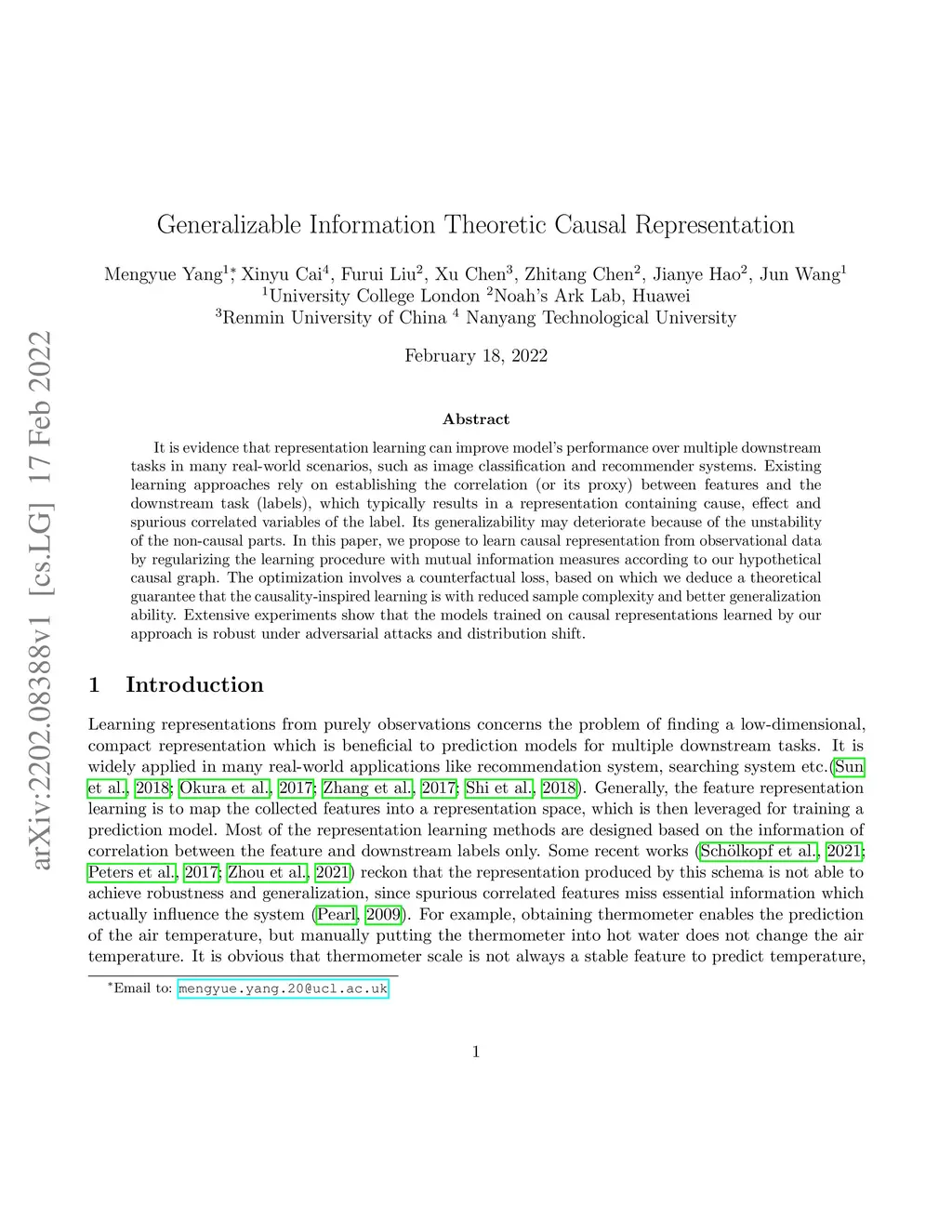 It is evidence that representation learning can improve model's performance over multiple downstream tasks in many real-world scenarios, such as image classification and recommender systems. Existing learning approaches rely on establishing the correlation (or its proxy) between features and the downstream task (labels), which typically results in a representation containing cause, effect and spurious correlated variables of the label. Its generalizability may deteriorate because of the unstability of the non-causal parts. In this paper, we propose to learn causal representation from observational data by regularizing the learning procedure with mutual information measures according to our hypothetical causal graph. The optimization involves a counterfactual loss, based on which we deduce a theoretical guarantee that the causality-inspired learning is with reduced sample complexity and better generalization ability. Extensive experiments show that the models trained on causal representations learned by our approach is robust under adversarial attacks and distribution shift.