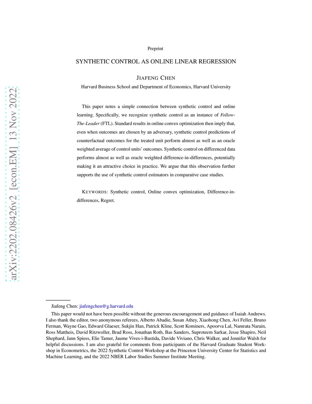 This paper notes a simple connection between synthetic control and online learning. Specifically, we recognize synthetic control as an instance of Follow-The-Leader (FTL). Standard results in online convex optimization then imply that, even when outcomes are chosen by an adversary, synthetic control predictions of counterfactual outcomes for the treated unit perform almost as well as an oracle weighted average of control units' outcomes. Synthetic control on differenced data performs almost as well as oracle weighted difference-in-differences, potentially making it an attractive choice in practice. We argue that this observation further supports the use of synthetic control estimators in comparative case studies.
