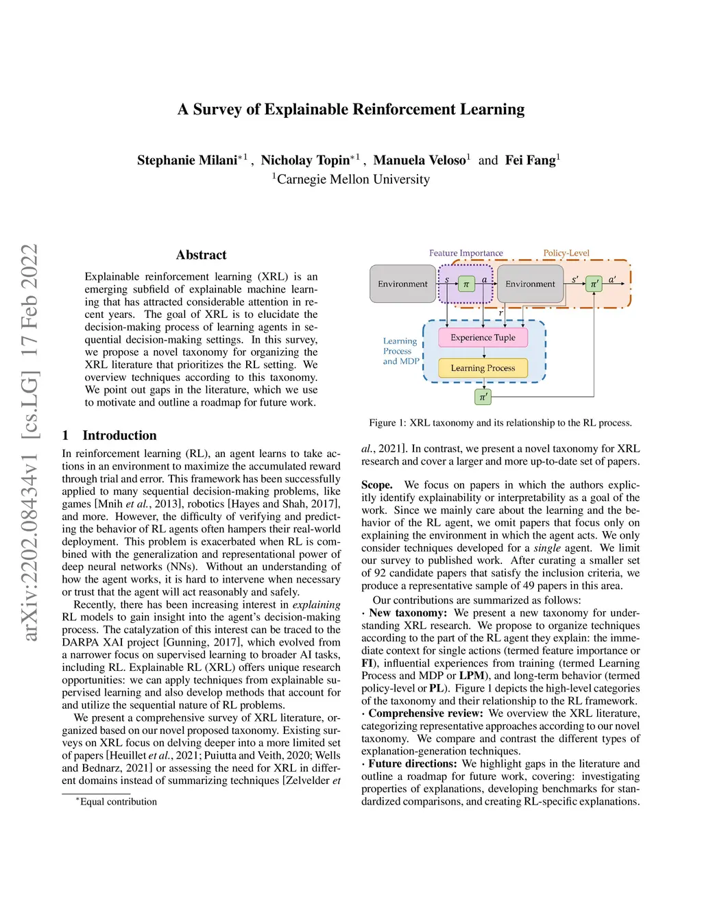 Explainable reinforcement learning (XRL) is an emerging subfield of explainable machine learning that has attracted considerable attention in recent years. The goal of XRL is to elucidate the decision-making process of learning agents in sequential decision-making settings. In this survey, we propose a novel taxonomy for organizing the XRL literature that prioritizes the RL setting. We overview techniques according to this taxonomy. We point out gaps in the literature, which we use to motivate and outline a roadmap for future work.