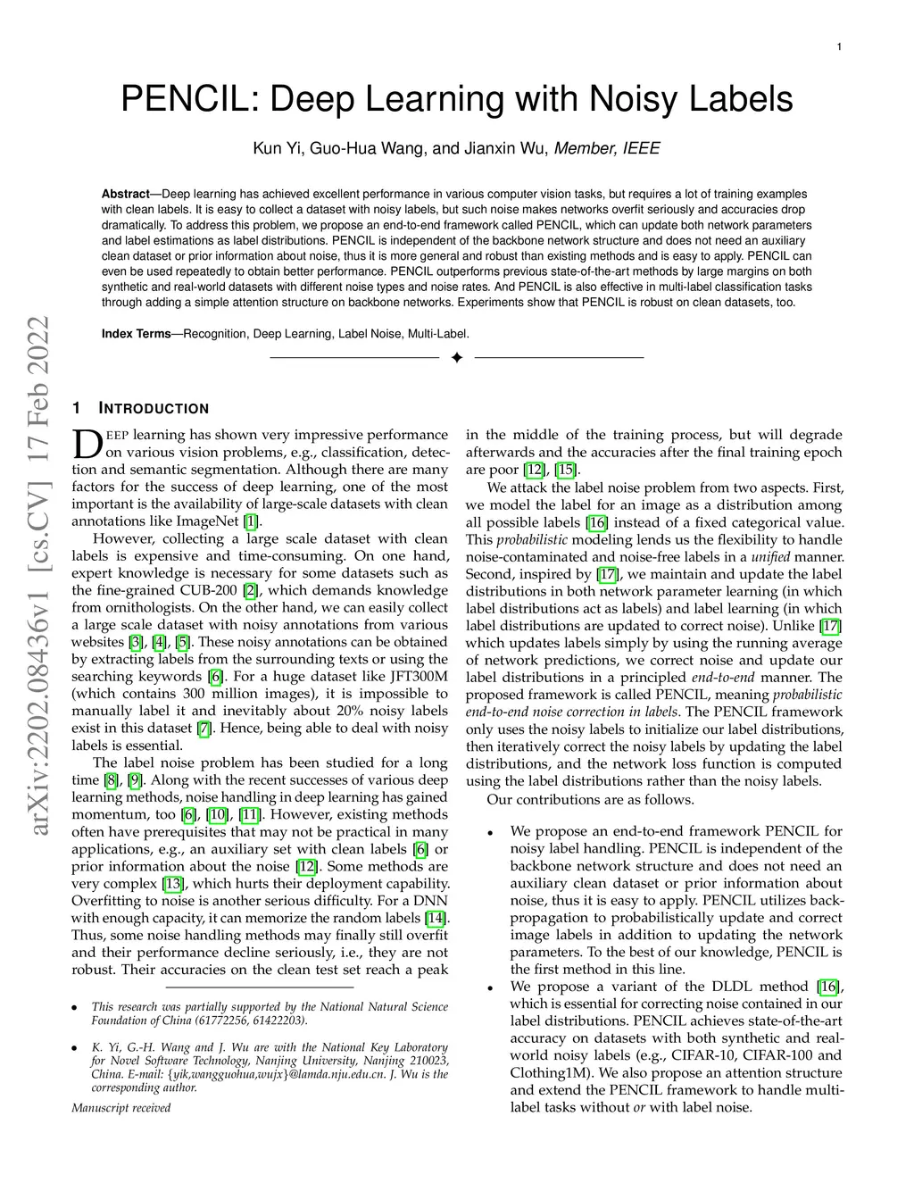 Deep learning has achieved excellent performance in various computer vision tasks, but requires a lot of training examples with clean labels. It is easy to collect a dataset with noisy labels, but such noise makes networks overfit seriously and accuracies drop dramatically. To address this problem, we propose an end-to-end framework called PENCIL, which can update both network parameters and label estimations as label distributions. PENCIL is independent of the backbone network structure and does not need an auxiliary clean dataset or prior information about noise, thus it is more general and robust than existing methods and is easy to apply. PENCIL can even be used repeatedly to obtain better performance. PENCIL outperforms previous state-of-the-art methods by large margins on both synthetic and real-world datasets with different noise types and noise rates. And PENCIL is also effective in multi-label classification tasks through adding a simple attention structure on backbone networks. Experiments show that PENCIL is robust on clean datasets, too.
