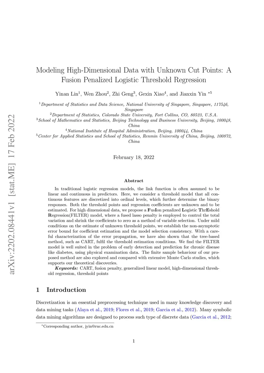 In traditional logistic regression models, the link function is often assumed to be linear and continuous in predictors. Here, we consider a threshold model that all continuous features are discretized into ordinal levels, which further determine the binary responses. Both the threshold points and regression coefficients are unknown and to be estimated. For high dimensional data, we propose a fusion penalized logistic threshold regression (FILTER) model, where a fused lasso penalty is employed to control the total variation and shrink the coefficients to zero as a method of variable selection. Under mild conditions on the estimate of unknown threshold points, we establish the non-asymptotic error bound for coefficient estimation and the model selection consistency. With a careful characterization of the error propagation, we have also shown that the tree-based method, such as CART, fulfill the threshold estimation conditions. We find the FILTER model is well suited in the problem of early detection and prediction for chronic disease like diabetes, using physical examination data. The finite sample behavior of our proposed method are also explored and compared with extensive Monte Carlo studies, which supports our theoretical discoveries.