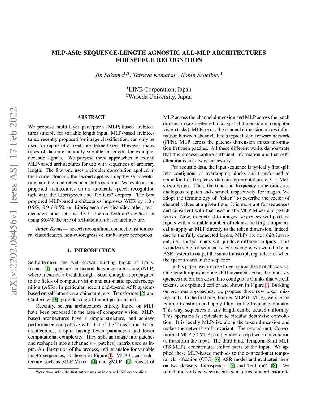 We propose multi-layer perceptron (MLP)-based architectures suitable for variable length input. MLP-based architectures, recently proposed for image classification, can only be used for inputs of a fixed, pre-defined size. However, many types of data are naturally variable in length, for example, acoustic signals. We propose three approaches to extend MLP-based architectures for use with sequences of arbitrary length. The first one uses a circular convolution applied in the Fourier domain, the second applies a depthwise convolution, and the final relies on a shift operation. We evaluate the proposed architectures on an automatic speech recognition task with the Librispeech and Tedlium2 corpora. The best proposed MLP-based architectures improves WER by 1.0 / 0.9%, 0.9 / 0.5% on Librispeech dev-clean/dev-other, test-clean/test-other set, and 0.8 / 1.1% on Tedlium2 dev/test set using 86.4% the size of self-attention-based architecture.