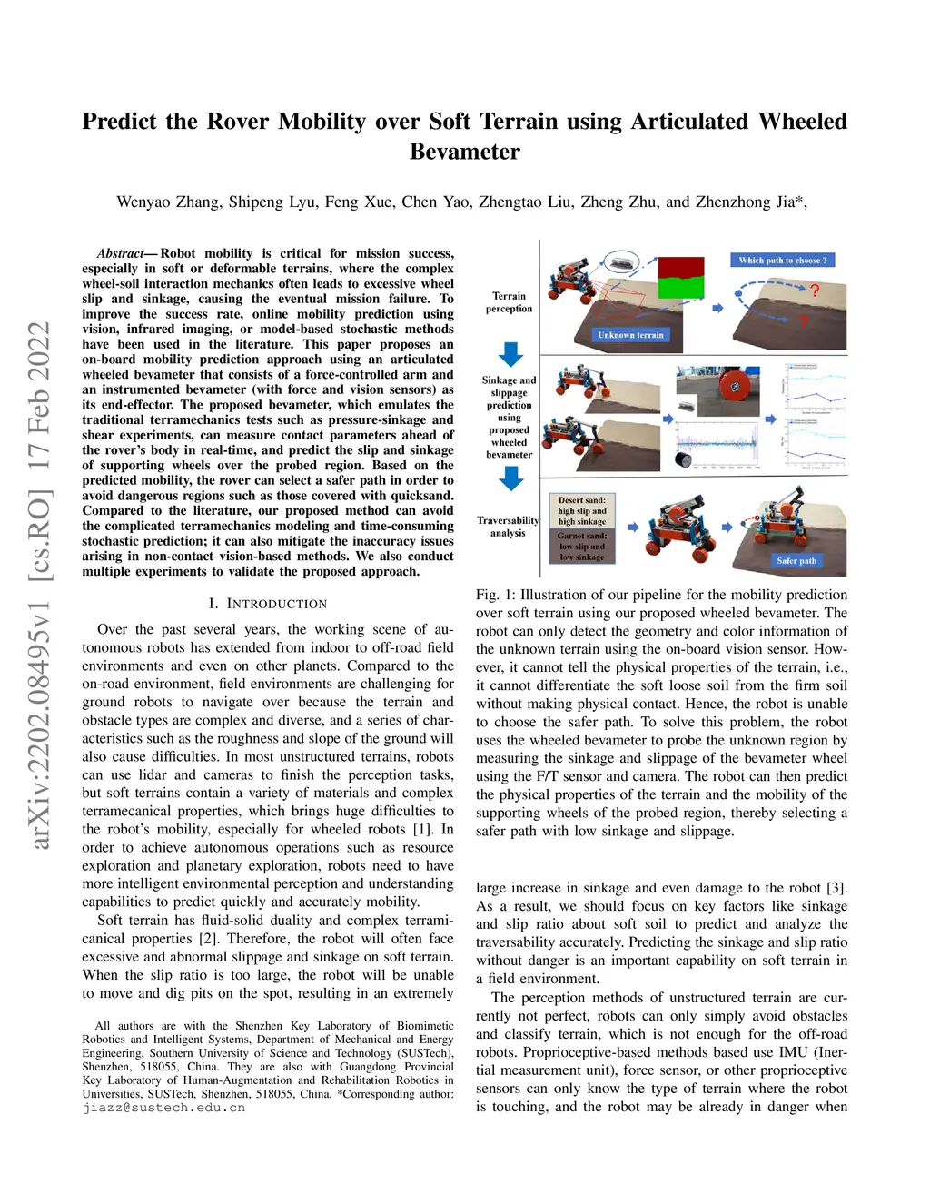 Robot mobility is critical for mission success, especially in soft or deformable terrains, where the complex wheel-soil interaction mechanics often leads to excessive wheel slip and sinkage, causing the eventual mission failure. To improve the success rate, online mobility prediction using vision, infrared imaging, or model-based stochastic methods have been used in the literature. This paper proposes an on-board mobility prediction approach using an articulated wheeled bevameter that consists of a force-controlled arm and an instrumented bevameter (with force and vision sensors) as its end-effector. The proposed bevameter, which emulates the traditional terramechanics tests such as pressure-sinkage and shear experiments, can measure contact parameters ahead of the rover's body in real-time, and predict the slip and sinkage of supporting wheels over the probed region. Based on the predicted mobility, the rover can select a safer path in order to avoid dangerous regions such as those covered with quicksand. Compared to the literature, our proposed method can avoid the complicated terramechanics modeling and time-consuming stochastic prediction; it can also mitigate the inaccuracy issues arising in non-contact vision-based methods. We also conduct multiple experiments to validate the proposed approach.