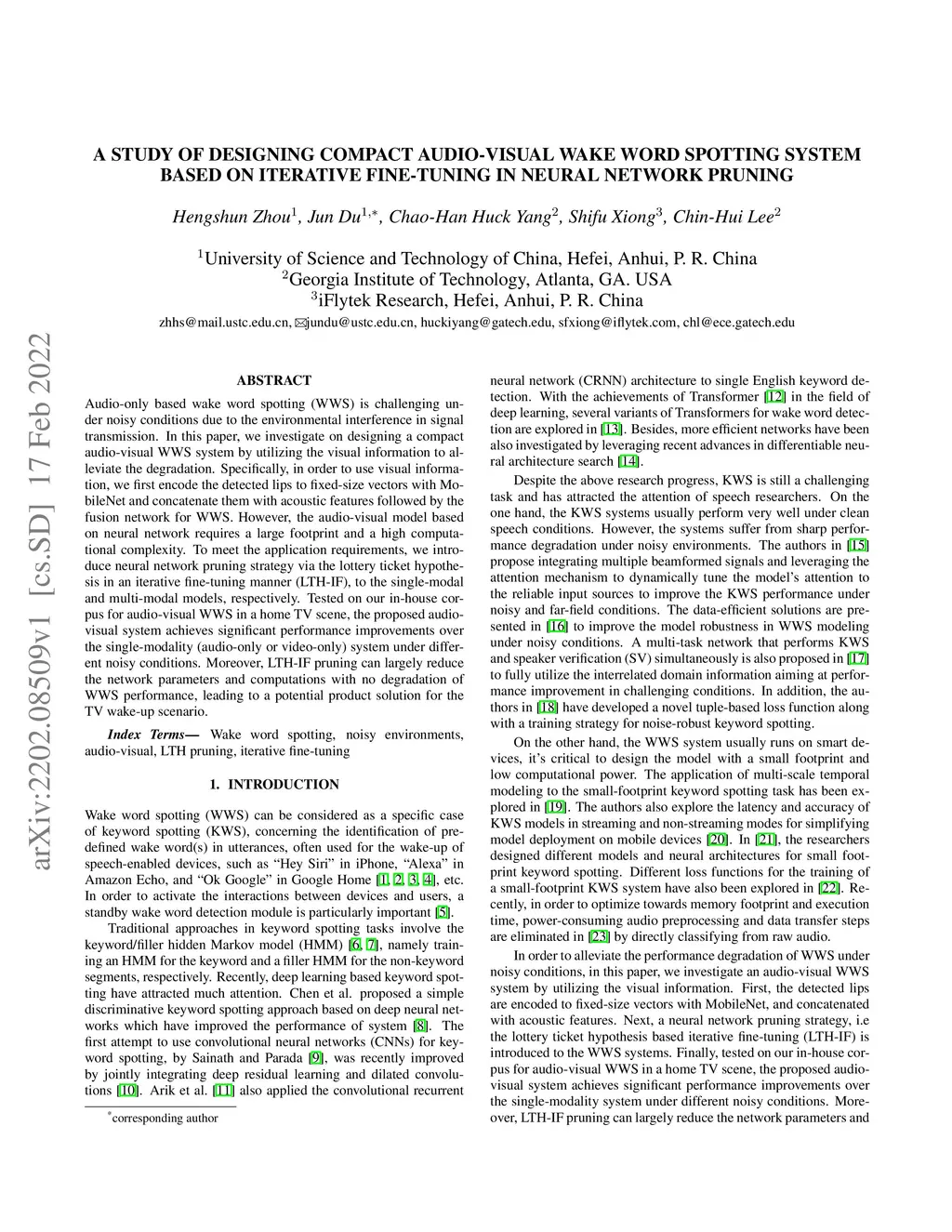 Audio-only-based wake word spotting (WWS) is challenging under noisy conditions due to environmental interference in signal transmission. In this paper, we investigate on designing a compact audio-visual WWS system by utilizing visual information to alleviate the degradation. Specifically, in order to use visual information, we first encode the detected lips to fixed-size vectors with MobileNet and concatenate them with acoustic features followed by the fusion network for WWS. However, the audio-visual model based on neural networks requires a large footprint and a high computational complexity. To meet the application requirements, we introduce a neural network pruning strategy via the lottery ticket hypothesis in an iterative fine-tuning manner (LTH-IF), to the single-modal and multi-modal models, respectively. Tested on our in-house corpus for audio-visual WWS in a home TV scene, the proposed audio-visual system achieves significant performance improvements over the single-modality (audio-only or video-only) system under different noisy conditions. Moreover, LTH-IF pruning can largely reduce the network parameters and computations with no degradation of WWS performance, leading to a potential product solution for the TV wake-up scenario.