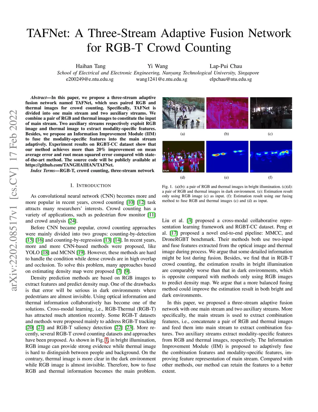In this paper, we propose a three-stream adaptive fusion network named TAFNet, which uses paired RGB and thermal images for crowd counting. Specifically, TAFNet is divided into one main stream and two auxiliary streams. We combine a pair of RGB and thermal images to constitute the input of main stream. Two auxiliary streams respectively exploit RGB image and thermal image to extract modality-specific features. Besides, we propose an Information Improvement Module (IIM) to fuse the modality-specific features into the main stream adaptively. Experiment results on RGBT-CC dataset show that our method achieves more than 20% improvement on mean average error and root mean squared error compared with state-of-the-art method. The source code will be publicly available at https://github.com/TANGHAIHAN/TAFNet.