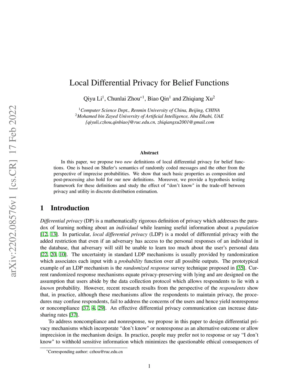 In this paper, we propose two new definitions of local differential privacy for belief functions. One is based on Shafer's semantics of randomly coded messages and the other from the perspective of imprecise probabilities. We show that such basic properties as composition and post-processing also hold for our new definitions. Moreover, we provide a hypothesis testing framework for these definitions and study the effect of "don't know" in the trade-off between privacy and utility in discrete distribution estimation.
