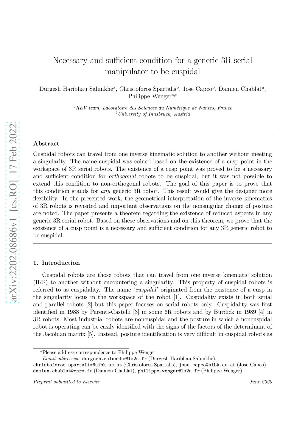 Cuspidal robots can travel from one inverse kinematic solution to another without meeting a singularity. The name cuspidal was coined based on the existence of a cusp point in the workspace of 3R serial robots. The existence of a cusp point was proved to be a necessary and sufficient condition for orthogonal robots to be cuspidal, but it was not possible to extend this condition to non-orthogonal robots. The goal of this paper is to prove that this condition stands for any generic 3R robot. This result would give the designer more flexibility. In the presented work, the geometrical interpretation of the inverse kinematics of 3R robots is revisited and important observations on the nonsingular change of posture are noted. The paper presents a theorem regarding the existence of reduced aspects in any generic 3R serial robot. Based on these observations and on this theorem, we prove that the existence of a cusp point is a necessary and sufficient condition for any 3R generic robot to be cuspidal.