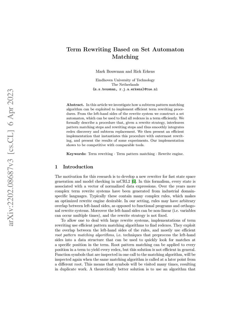 In this article we investigate how a subterm pattern matching algorithm can be exploited to implement efficient term rewriting procedures. From the left-hand sides of the rewrite system we construct a set automaton, which can be used to find all redexes in a term efficiently. We formally describe a procedure that, given a rewrite strategy, interleaves pattern matching steps and rewriting steps and thus smoothly integrates redex discovery and subterm replacement. We then present an efficient implementation that instantiates this procedure with outermost rewriting, and present the results of some experiments. Our implementation shows to be competitive with comparable tools.
