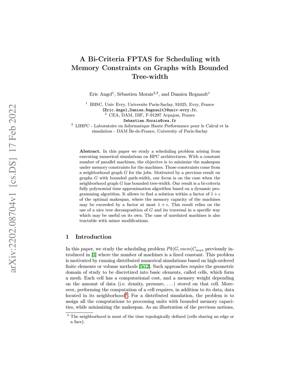 In this paper we study a scheduling problem arising from executing numerical simulations on HPC architectures. With a constant number of parallel machines, the objective is to minimize the makespan under memory constraints for the machines. Those constraints come from a neighborhood graph G for the jobs. Motivated by a previous result on graphs G with bounded path-width, our focus is on the case when the neighborhood graph G has bounded tree-width. Our result is a bi-criteria fully polynomial time approximation algorithm based on a dynamic programming algorithm. It allows to find a solution within a factor of 1 + epsilon of the optimal makespan, where the memory capacity of the machines may be exceeded by a factor at most 1 + epsilon. This result relies on the use of a nice tree decomposition of G and its traversal in a specific way which may be useful on its own. The case of unrelated machines is also tractable with minor modifications.
