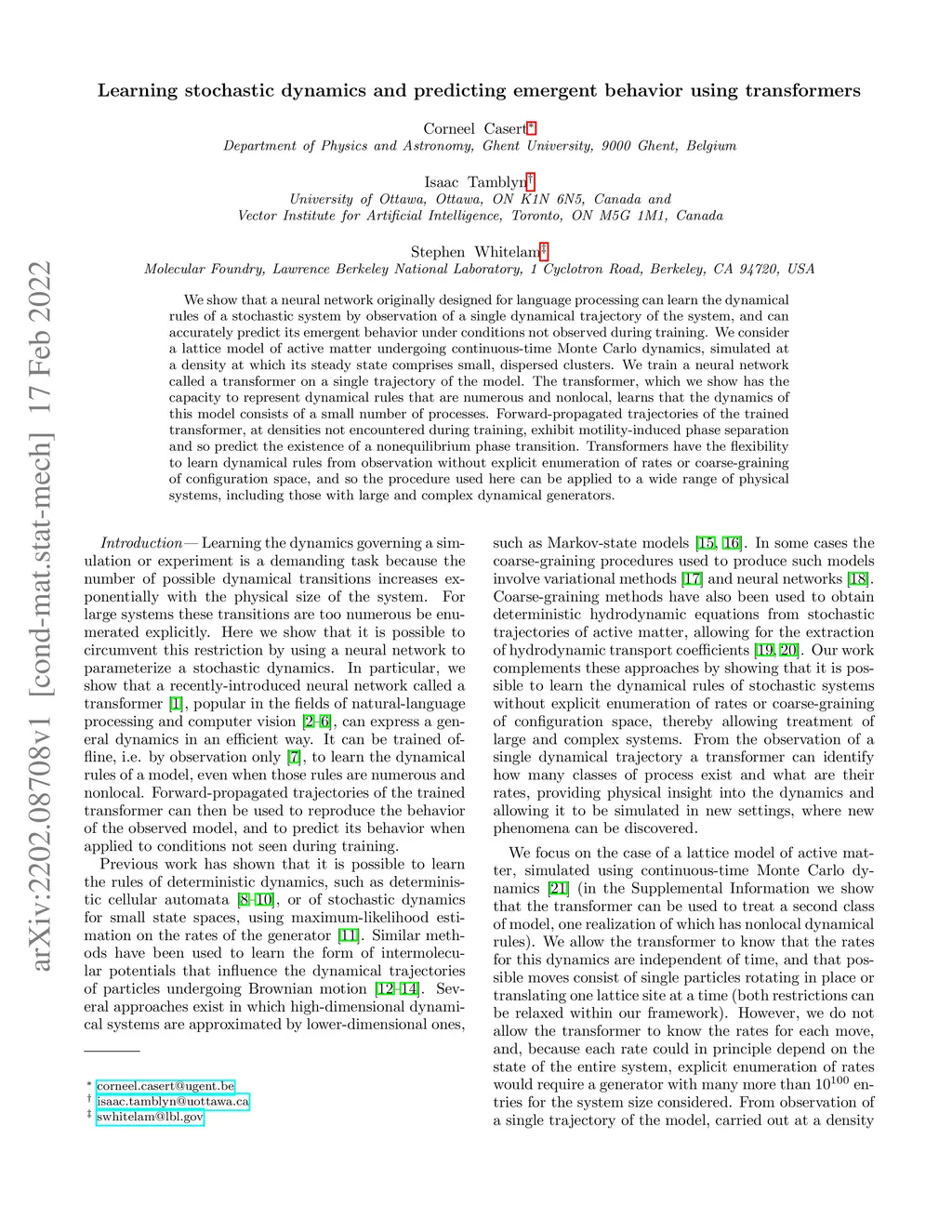 We show that a neural network originally designed for language processing can learn the dynamical rules of a stochastic system by observation of a single dynamical trajectory of the system, and can accurately predict its emergent behavior under conditions not observed during training. We consider a lattice model of active matter undergoing continuous-time Monte Carlo dynamics, simulated at a density at which its steady state comprises small, dispersed clusters. We train a neural network called a transformer on a single trajectory of the model. The transformer, which we show has the capacity to represent dynamical rules that are numerous and nonlocal, learns that the dynamics of this model consists of a small number of processes. Forward-propagated trajectories of the trained transformer, at densities not encountered during training, exhibit motility-induced phase separation and so predict the existence of a nonequilibrium phase transition. Transformers have the flexibility to learn dynamical rules from observation without explicit enumeration of rates or coarse-graining of configuration space, and so the procedure used here can be applied to a wide range of physical systems, including those with large and complex dynamical generators.
