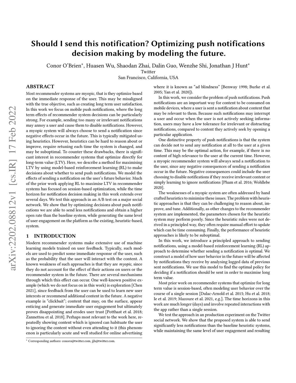 Most recommender systems are myopic, that is they optimize based on the immediate response of the user. This may be misaligned with the true objective, such as creating long term user satisfaction. In this work we focus on mobile push notifications, where the long term effects of recommender system decisions can be particularly strong. For example, sending too many or irrelevant notifications may annoy a user and cause them to disable notifications. However, a myopic system will always choose to send a notification since negative effects occur in the future. This is typically mitigated using heuristics. However, heuristics can be hard to reason about or improve, require retuning each time the system is changed, and may be suboptimal. To counter these drawbacks, there is significant interest in recommender systems that optimize directly for long-term value (LTV). Here, we describe a method for maximising LTV by using model-based reinforcement learning (RL) to make decisions about whether to send push notifications. We model the effects of sending a notification on the user's future behavior. Much of the prior work applying RL to maximise LTV in recommender systems has focused on session-based optimization, while the time horizon for notification decision making in this work extends over several days. We test this approach in an A/B test on a major social network. We show that by optimizing decisions about push notifications we are able to send less notifications and obtain a higher open rate than the baseline system, while generating the same level of user engagement on the platform as the existing, heuristic-based, system.