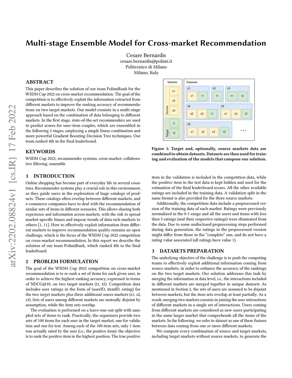 This paper describes the solution of our team PolimiRank for the WSDM Cup 2022 on cross-market recommendation. The goal of the competition is to effectively exploit the information extracted from different markets to improve the ranking accuracy of recommendations on two target markets. Our model consists in a multi-stage approach based on the combination of data belonging to different markets. In the first stage, state-of-the-art recommenders are used to predict scores for user-item couples, which are ensembled in the following 2 stages, employing a simple linear combination and more powerful Gradient Boosting Decision Tree techniques. Our team ranked 4th in the final leaderboard.