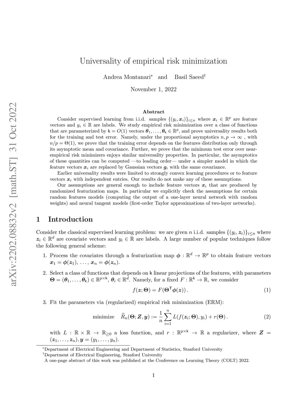 Consider supervised learning from i.i.d. samples where are feature vectors and are labels. We study empirical risk minimization over a class of functions that are parameterized by vectors , and prove universality results both for the training and test error. Namely, under the proportional asymptotics , with , we prove that the training error depends on the random features distribution only through its covariance structure. Further, we prove that the minimum test error over near-empirical risk minimizers enjoys similar universality properties. In particular, the asymptotics of these quantities can be computed to leading order under a simpler model in which the feature vectors are replaced by Gaussian vectors with the same covariance. Earlier universality results were limited to strongly convex learning procedures, or to feature vectors with independent entries. Our results do not make any of these assumptions. Our assumptions are general enough to include feature vectors that are produced by randomized featurization maps. In particular we explicitly check the assumptions for certain random features models (computing the output of a one-layer neural network with random weights) and neural tangent models (first-order Taylor approximation of two-layer networks).