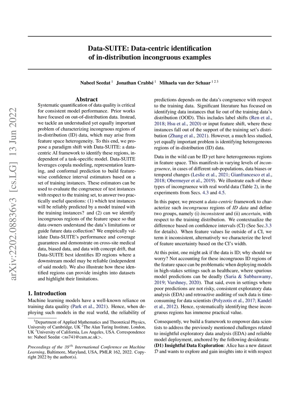 Systematic quantification of data quality is critical for consistent model performance. Prior works have focused on out-of-distribution data. Instead, we tackle an understudied yet equally important problem of characterizing incongruous regions of in-distribution (ID) data, which may arise from feature space heterogeneity. To this end, we propose a paradigm shift with Data-SUITE: a data-centric AI framework to identify these regions, independent of a task-specific model. Data-SUITE leverages copula modeling, representation learning, and conformal prediction to build feature-wise confidence interval estimators based on a set of training instances. These estimators can be used to evaluate the congruence of test instances with respect to the training set, to answer two practically useful questions: (1) which test instances will be reliably predicted by a model trained with the training instances? and (2) can we identify incongruous regions of the feature space so that data owners understand the data's limitations or guide future data collection? We empirically validate Data-SUITE's performance and coverage guarantees and demonstrate on cross-site medical data, biased data, and data with concept drift, that Data-SUITE best identifies ID regions where a downstream model may be reliable (independent of said model). We also illustrate how these identified regions can provide insights into datasets and highlight their limitations.