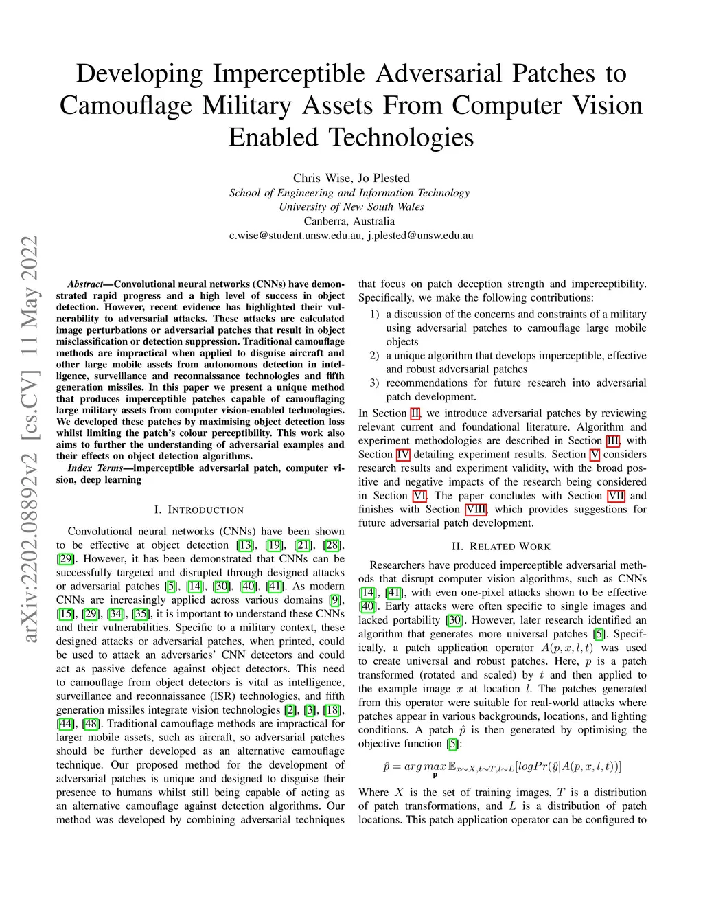 Convolutional neural networks (CNNs) have demonstrated rapid progress and a high level of success in object detection. However, recent evidence has highlighted their vulnerability to adversarial attacks. These attacks are calculated image perturbations or adversarial patches that result in object misclassification or detection suppression. Traditional camouflage methods are impractical when applied to disguise aircraft and other large mobile assets from autonomous detection in intelligence, surveillance and reconnaissance technologies and fifth generation missiles. In this paper we present a unique method that produces imperceptible patches capable of camouflaging large military assets from computer vision-enabled technologies. We developed these patches by maximising object detection loss whilst limiting the patch's colour perceptibility. This work also aims to further the understanding of adversarial examples and their effects on object detection algorithms.