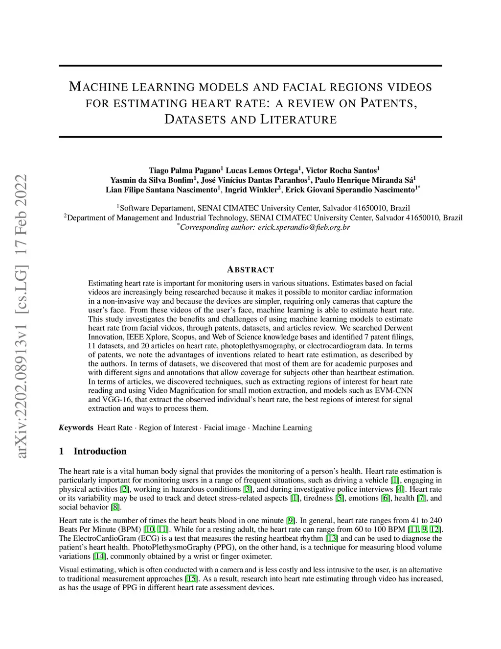 Estimating heart rate is important for monitoring users in various situations. Estimates based on facial videos are increasingly being researched because it makes it possible to monitor cardiac information in a non-invasive way and because the devices are simpler, requiring only cameras that capture the user's face. From these videos of the user's face, machine learning is able to estimate heart rate. This study investigates the benefits and challenges of using machine learning models to estimate heart rate from facial videos, through patents, datasets, and articles review. We searched Derwent Innovation, IEEE Xplore, Scopus, and Web of Science knowledge bases and identified 7 patent filings, 11 datasets, and 20 articles on heart rate, photoplethysmography, or electrocardiogram data. In terms of patents, we note the advantages of inventions related to heart rate estimation, as described by the authors. In terms of datasets, we discovered that most of them are for academic purposes and with different signs and annotations that allow coverage for subjects other than heartbeat estimation. In terms of articles, we discovered techniques, such as extracting regions of interest for heart rate reading and using Video Magnification for small motion extraction, and models such as EVM-CNN and VGG-16, that extract the observed individual's heart rate, the best regions of interest for signal extraction and ways to process them.