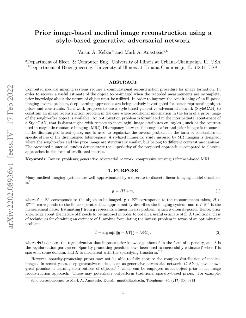 Computed medical imaging systems require a computational reconstruction procedure for image formation. In order to recover a useful estimate of the object to-be-imaged when the recorded measurements are incomplete, prior knowledge about the nature of object must be utilized. In order to improve the conditioning of an ill-posed imaging inverse problem, deep learning approaches are being actively investigated for better representing object priors and constraints. This work proposes to use a style-based generative adversarial network (StyleGAN) to constrain an image reconstruction problem in the case where additional information in the form of a prior image of the sought-after object is available. An optimization problem is formulated in the intermediate latent-space of a StyleGAN, that is disentangled with respect to meaningful image attributes or "styles", such as the contrast used in magnetic resonance imaging (MRI). Discrepancy between the sought-after and prior images is measured in the disentangled latent-space, and is used to regularize the inverse problem in the form of constraints on specific styles of the disentangled latent-space. A stylized numerical study inspired by MR imaging is designed, where the sought-after and the prior image are structurally similar, but belong to different contrast mechanisms. The presented numerical studies demonstrate the superiority of the proposed approach as compared to classical approaches in the form of traditional metrics.