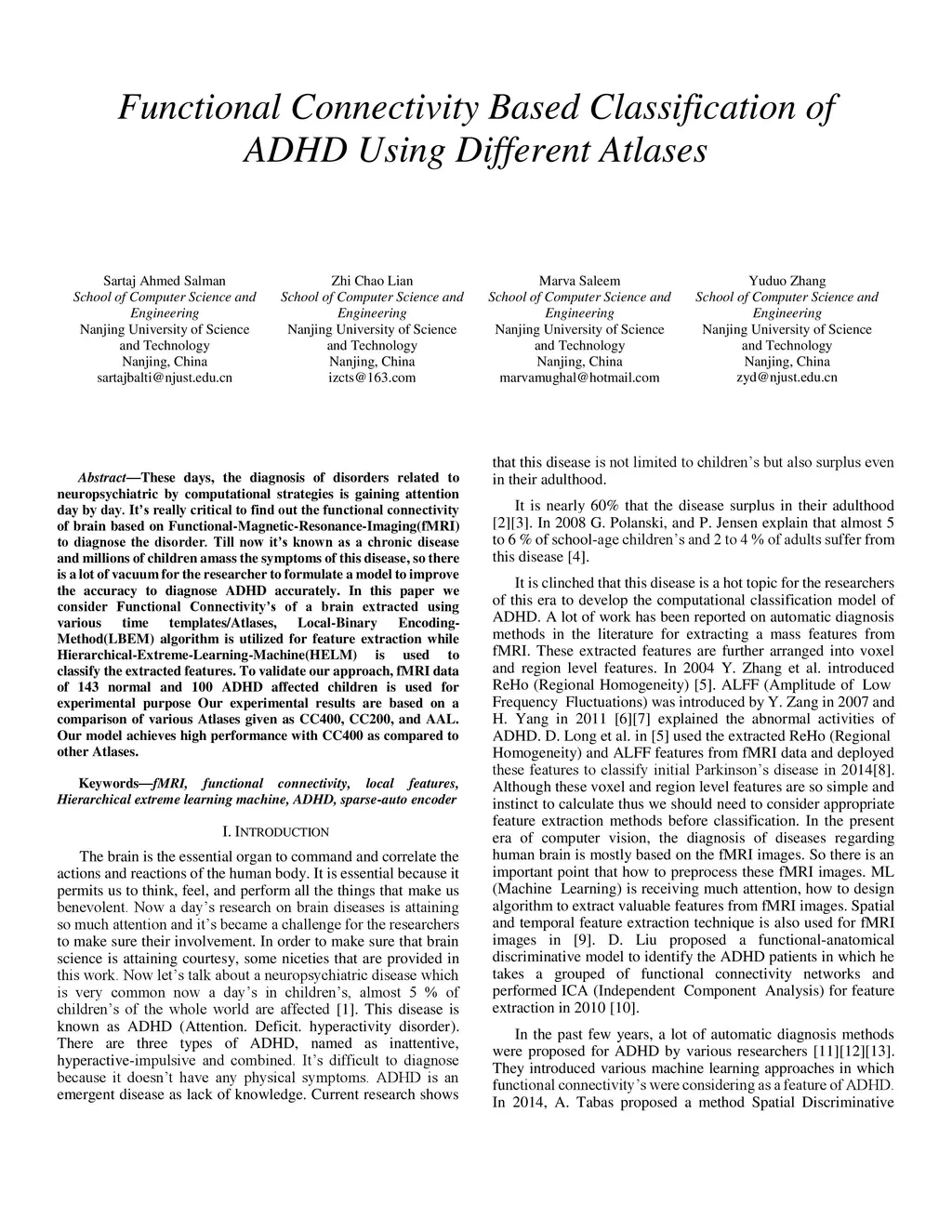 These days, computational diagnosis strategies of neuropsychiatric disorders are gaining attention day by day. It's critical to determine the brain's functional connectivity based on Functional-Magnetic-Resonance-Imaging(fMRI) to diagnose the disorder. It's known as a chronic disease, and millions of children amass the symptoms of this disease, so there is much vacuum for the researcher to formulate a model to improve the accuracy to diagnose ADHD accurately. In this paper, we consider the functional connectivity of a brain extracted using various time templates/Atlases. Local-Binary Encoding-Method (LBEM) algorithm is utilized for feature extraction, while Hierarchical- Extreme-Learning-Machine (HELM) is used to classify the extracted features. To validate our approach, fMRI data of 143 normal and 100 ADHD affected children is used for experimental purpose. Our experimental results are based on comparing various Atlases given as CC400, CC200, and AAL. Our model achieves high performance with CC400 as compared to other Atlases