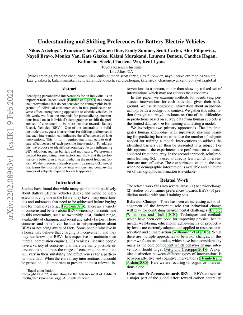 Identifying personalized interventions for an individual is an important task. Recent work has shown that interventions that do not consider the demographic background of individual consumers can, in fact, produce the reverse effect, strengthening opposition to electric vehicles. In this work, we focus on methods for personalizing interventions based on an individual's demographics to shift the preferences of consumers to be more positive towards Battery Electric Vehicles (BEVs). One of the constraints in building models to suggest interventions for shifting preferences is that each intervention can influence the effectiveness of later interventions. This, in turn, requires many subjects to evaluate effectiveness of each possible intervention. To address this, we propose to identify personalized factors influencing BEV adoption, such as barriers and motivators. We present a method for predicting these factors and show that the performance is better than always predicting the most frequent factors. We then present a Reinforcement Learning (RL) model that learns the most effective interventions, and compare the number of subjects required for each approach.