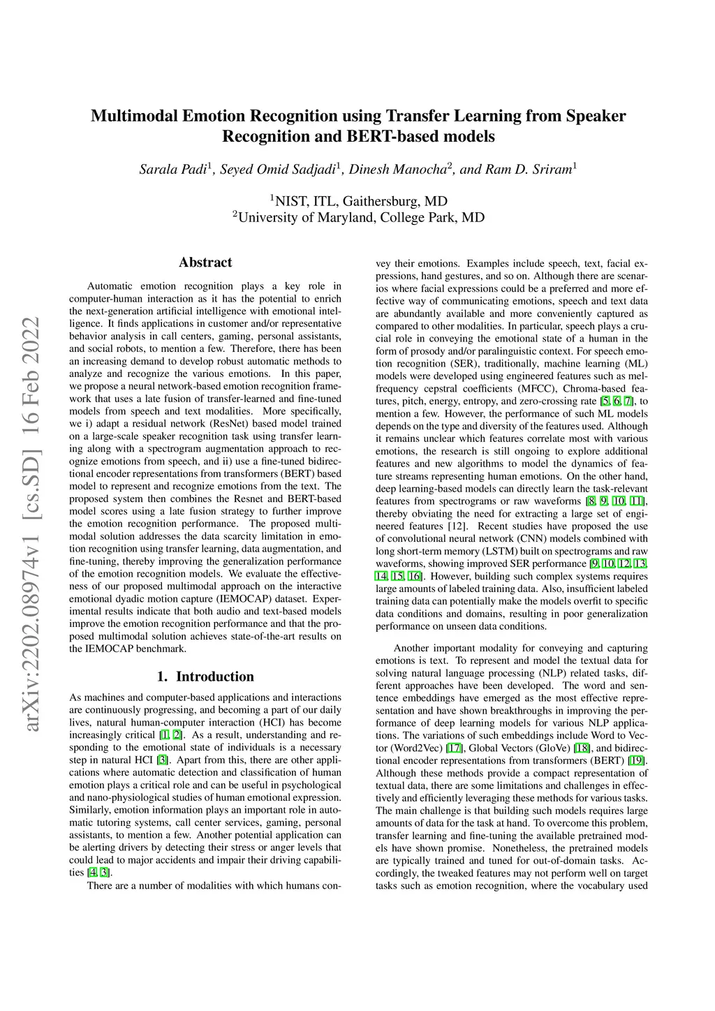 Automatic emotion recognition plays a key role in computer-human interaction as it has the potential to enrich the next-generation artificial intelligence with emotional intelligence. It finds applications in customer and/or representative behavior analysis in call centers, gaming, personal assistants, and social robots, to mention a few. Therefore, there has been an increasing demand to develop robust automatic methods to analyze and recognize the various emotions. In this paper, we propose a neural network-based emotion recognition framework that uses a late fusion of transfer-learned and fine-tuned models from speech and text modalities. More specifically, we i) adapt a residual network (ResNet) based model trained on a large-scale speaker recognition task using transfer learning along with a spectrogram augmentation approach to recognize emotions from speech, and ii) use a fine-tuned bidirectional encoder representations from transformers (BERT) based model to represent and recognize emotions from the text. The proposed system then combines the ResNet and BERT-based model scores using a late fusion strategy to further improve the emotion recognition performance. The proposed multimodal solution addresses the data scarcity limitation in emotion recognition using transfer learning, data augmentation, and fine-tuning, thereby improving the generalization performance of the emotion recognition models. We evaluate the effectiveness of our proposed multimodal approach on the interactive emotional dyadic motion capture (IEMOCAP) dataset. Experimental results indicate that both audio and text-based models improve the emotion recognition performance and that the proposed multimodal solution achieves state-of-the-art results on the IEMOCAP benchmark.