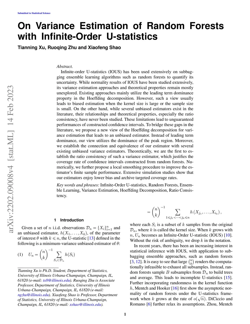 Infinite-order U-statistics (IOUS) has been used extensively on subbagging ensemble learning algorithms such as random forests to quantify its uncertainty. While normality results of IOUS have been studied extensively, its variance estimation approaches and theoretical properties remain mostly unexplored. Existing approaches mainly utilize the leading term dominance property in the Hoeffding decomposition. However, such a view usually leads to biased estimation when the kernel size is large or the sample size is small. On the other hand, while several unbiased estimators exist in the literature, their relationships and theoretical properties, especially the ratio consistency, have never been studied. These limitations lead to unguaranteed performances of constructed confidence intervals. To bridge these gaps in the literature, we propose a new view of the Hoeffding decomposition for variance estimation that leads to an unbiased estimator. Instead of leading term dominance, our view utilizes the dominance of the peak region. Moreover, we establish the connection and equivalence of our estimator with several existing unbiased variance estimators. Theoretically, we are the first to establish the ratio consistency of such a variance estimator, which justifies the coverage rate of confidence intervals constructed from random forests. Numerically, we further propose a local smoothing procedure to improve the estimator's finite sample performance. Extensive simulation studies show that our estimators enjoy lower bias and archive targeted coverage rates.