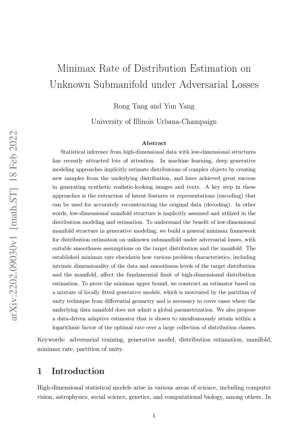 Statistical inference from high-dimensional data with low-dimensional structures has recently attracted lots of attention. In machine learning, deep generative modeling approaches implicitly estimate distributions of complex objects by creating new samples from the underlying distribution, and have achieved great success in generating synthetic realistic-looking images and texts. A key step in these approaches is the extraction of latent features or representations (encoding) that can be used for accurately reconstructing the original data (decoding). In other words, low-dimensional manifold structure is implicitly assumed and utilized in the distribution modeling and estimation. To understand the benefit of low-dimensional manifold structure in generative modeling, we build a general minimax framework for distribution estimation on unknown submanifold under adversarial losses, with suitable smoothness assumptions on the target distribution and the manifold. The established minimax rate elucidates how various problem characteristics, including intrinsic dimensionality of the data and smoothness levels of the target distribution and the manifold, affect the fundamental limit of high-dimensional distribution estimation. To prove the minimax upper bound, we construct an estimator based on a mixture of locally fitted generative models, which is motivated by the partition of unity technique from differential geometry and is necessary to cover cases where the underlying data manifold does not admit a global parametrization. We also propose a data-driven adaptive estimator that is shown to simultaneously attain within a logarithmic factor of the optimal rate over a large collection of distribution classes.