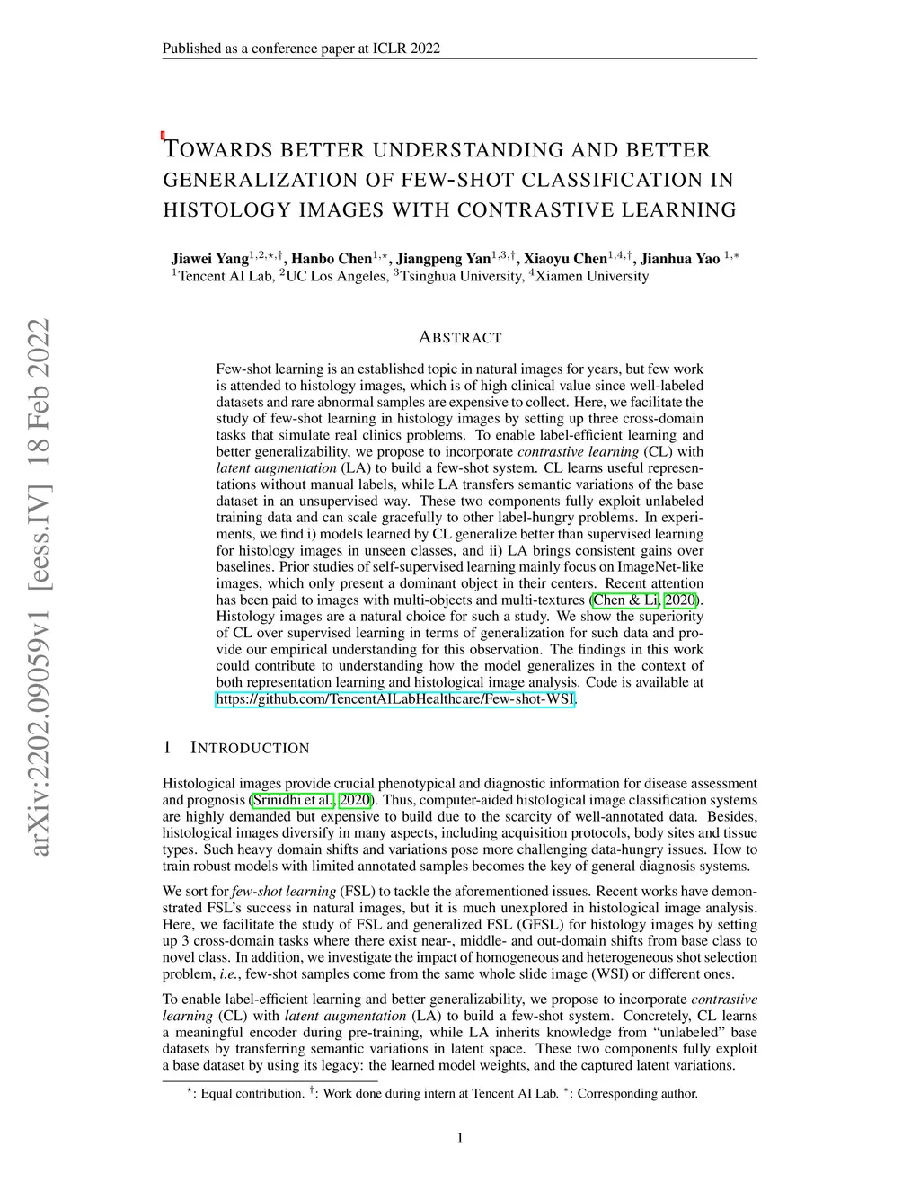 Few-shot learning is an established topic in natural images for years, but few work is attended to histology images, which is of high clinical value since well-labeled datasets and rare abnormal samples are expensive to collect. Here, we facilitate the study of few-shot learning in histology images by setting up three cross-domain tasks that simulate real clinics problems. To enable label-efficient learning and better generalizability, we propose to incorporate contrastive learning (CL) with latent augmentation (LA) to build a few-shot system. CL learns useful representations without manual labels, while LA transfers semantic variations of the base dataset in an unsupervised way. These two components fully exploit unlabeled training data and can scale gracefully to other label-hungry problems. In experiments, we find i) models learned by CL generalize better than supervised learning for histology images in unseen classes, and ii) LA brings consistent gains over baselines. Prior studies of self-supervised learning mainly focus on ImageNet-like images, which only present a dominant object in their centers. Recent attention has been paid to images with multi-objects and multi-textures. Histology images are a natural choice for such a study. We show the superiority of CL over supervised learning in terms of generalization for such data and provide our empirical understanding for this observation. The findings in this work could contribute to understanding how the model generalizes in the context of both representation learning and histological image analysis. Code is available.